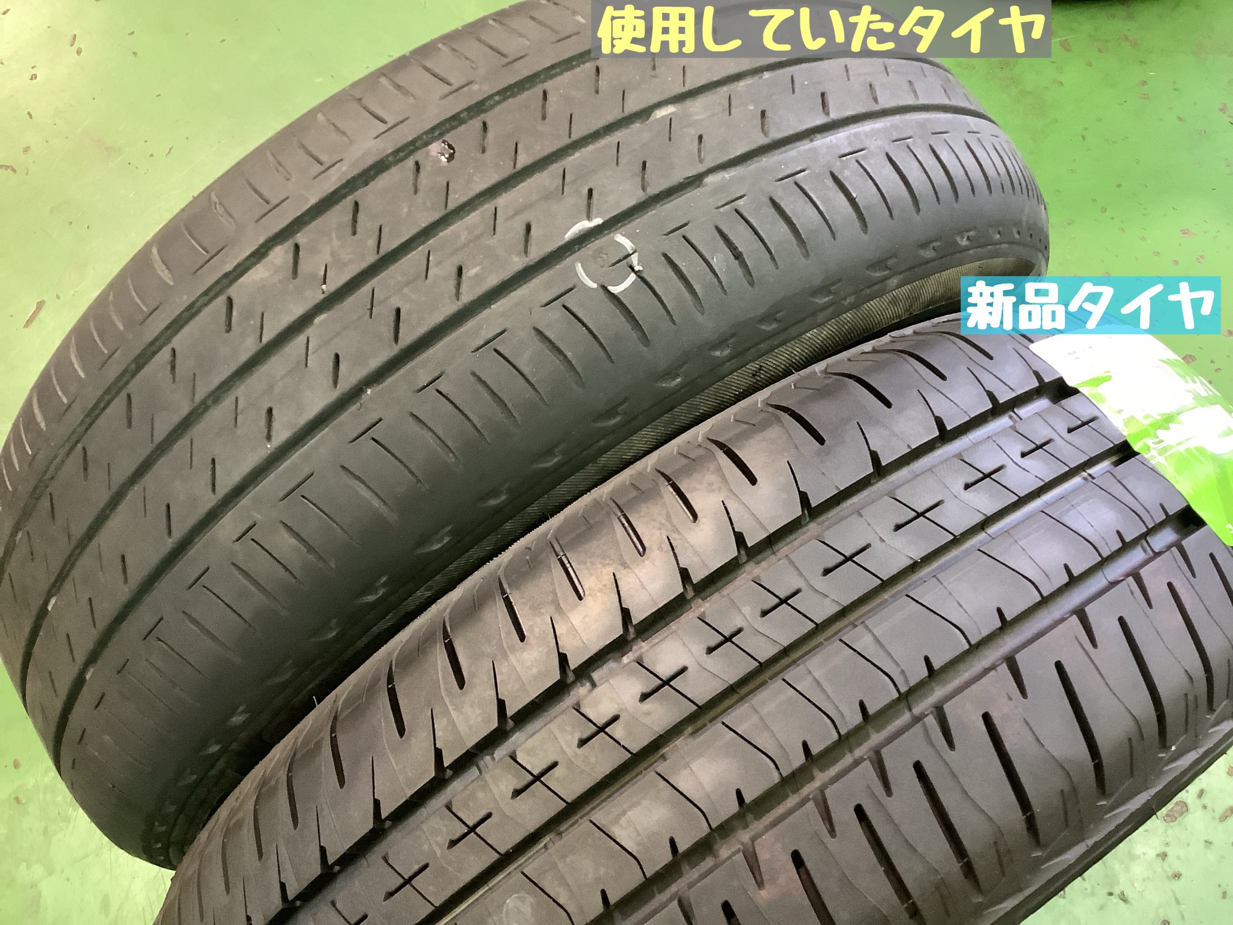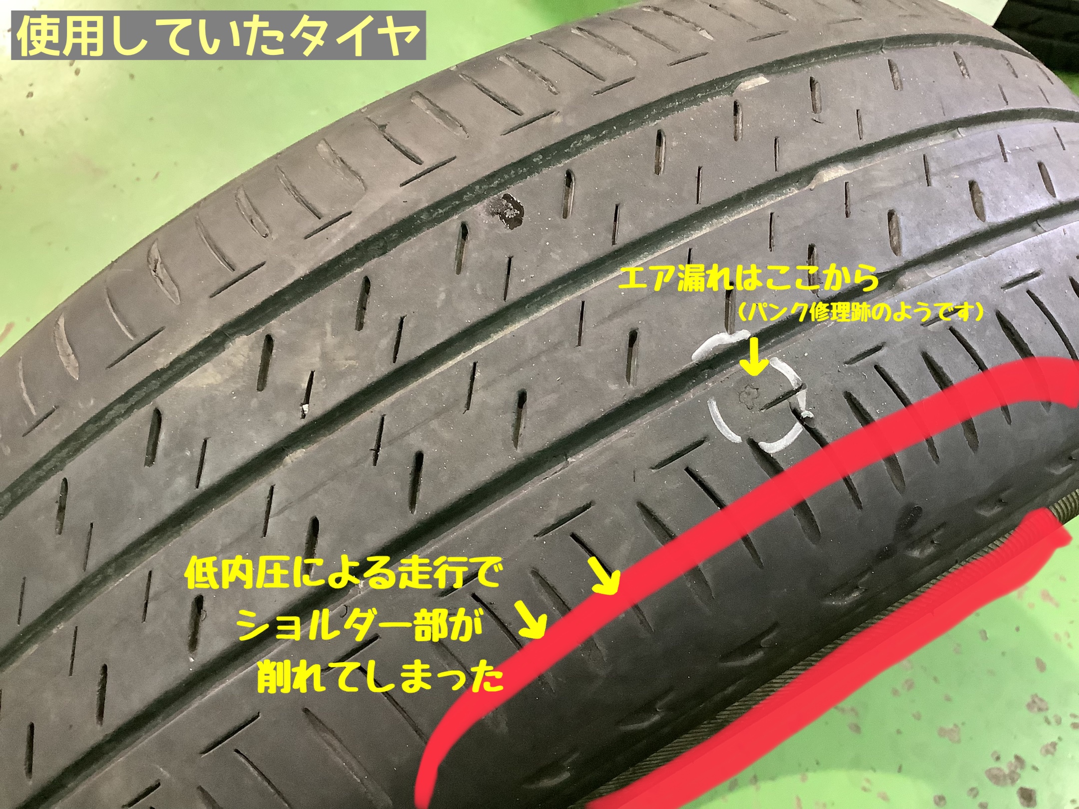 また空気圧不足でしばらく走行していたようで、タイヤのショルダー部が削れて、内部に損傷も見受けられたため、新品交換することとなりました。