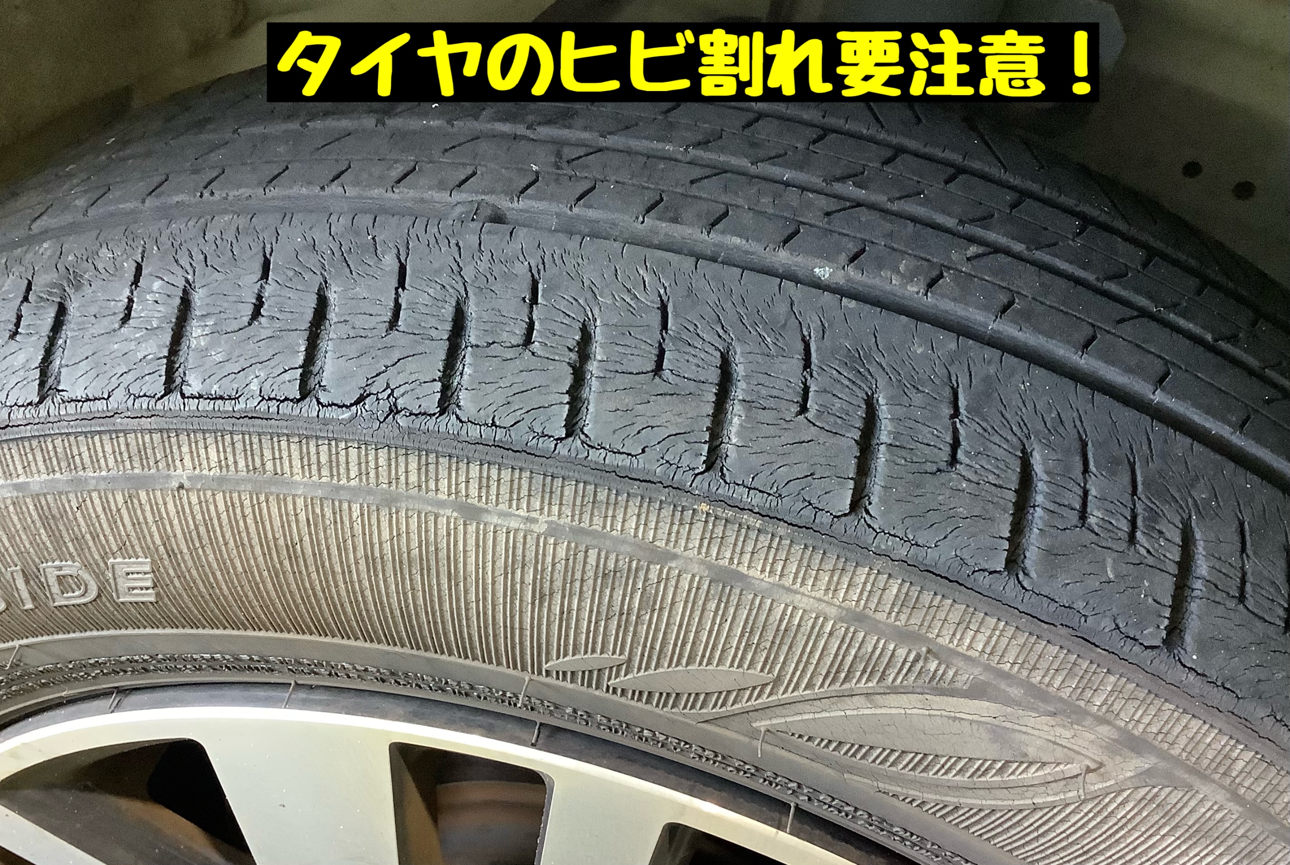 本日ご覧いただく写真は、クラック(ヒビ割れ)がたくさん出ているタイヤです…ヾ(゚Д゚)アワワワワ