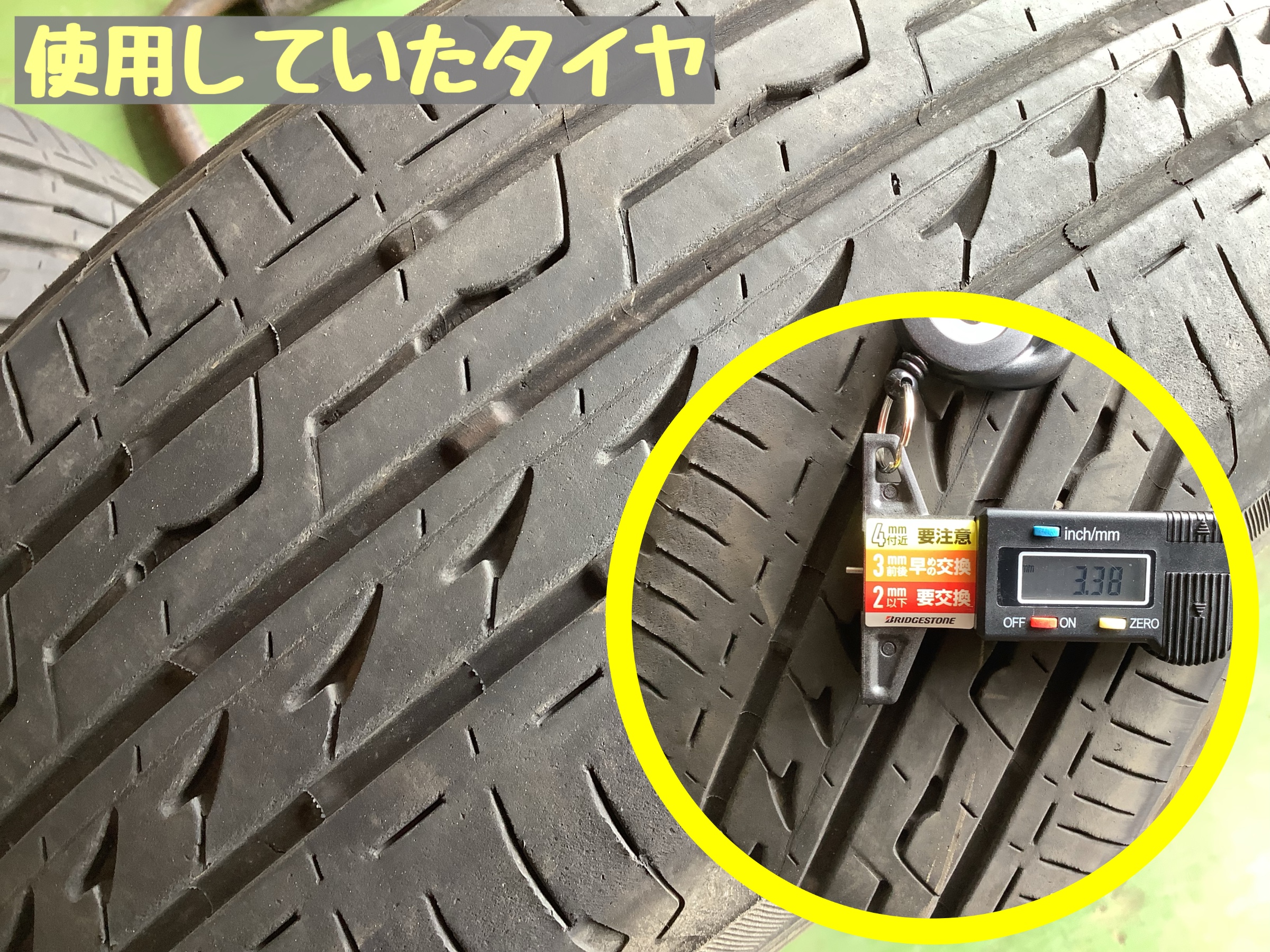 使用していたタイヤは、残り溝3.38㎜でちょうど交換時期をむかえておりました!!