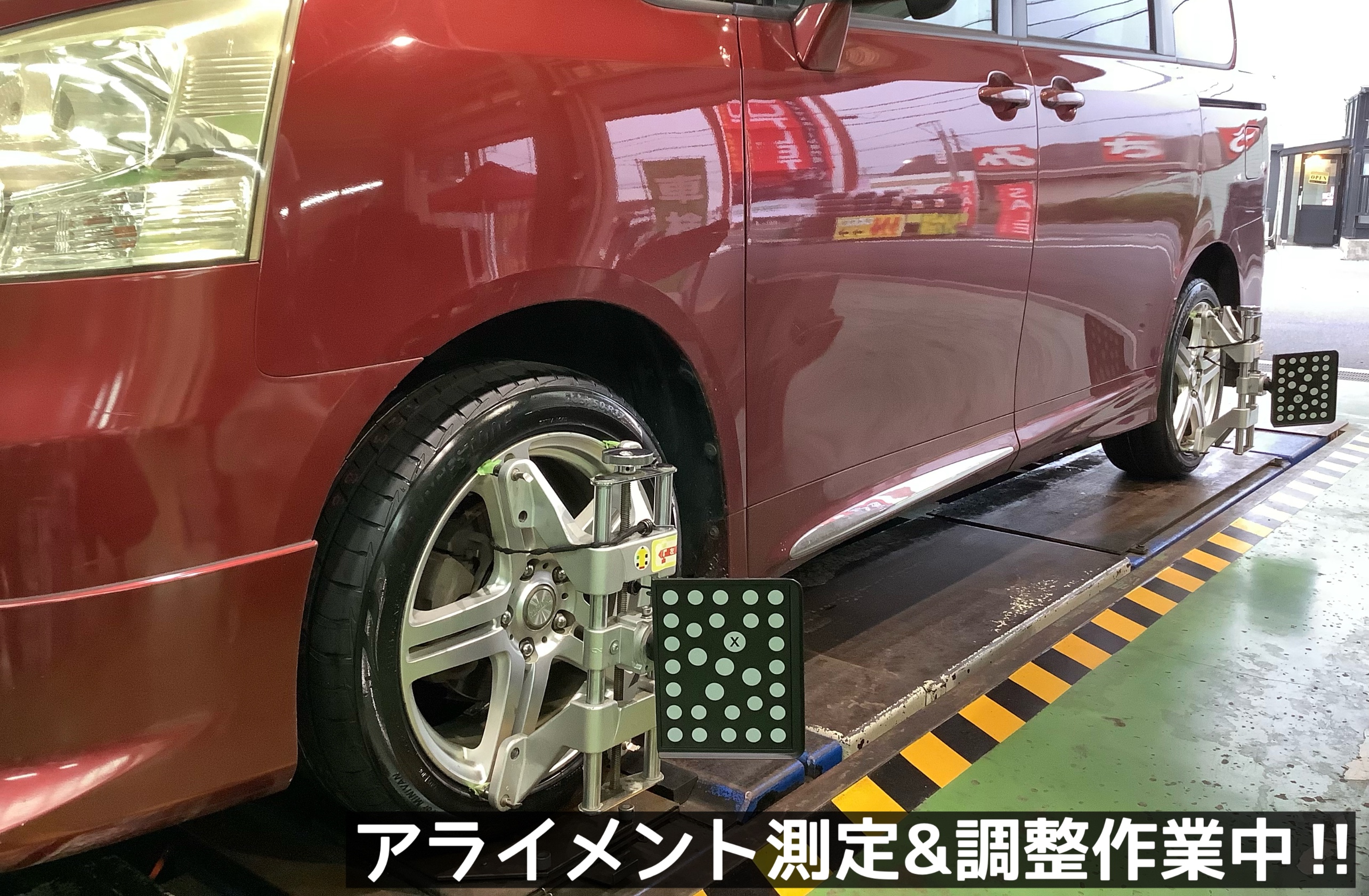 そして!タイヤ交換の後は、専用のセンサーを取り付け、タイヤの向き・角度を調整する「アライメント作業」!