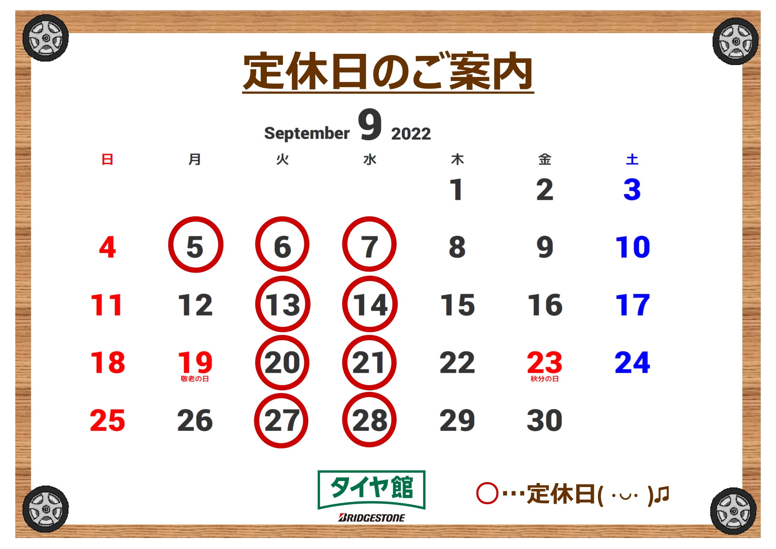 27日(火)・28日(水)は、定休日となります。