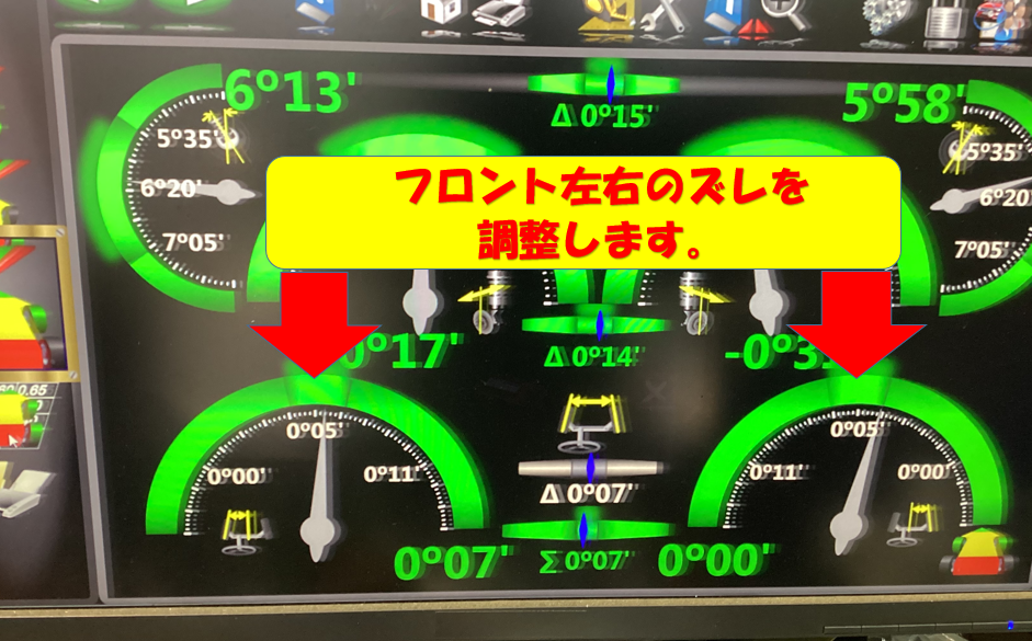 基準値内に入っていますがど真ん中に合わせていきます 新品タイヤを取り付けた時、測定調整をおすすめしております。ズレが大きくなると燃費の悪化タイヤの辺摩耗の悪化につながってきます。