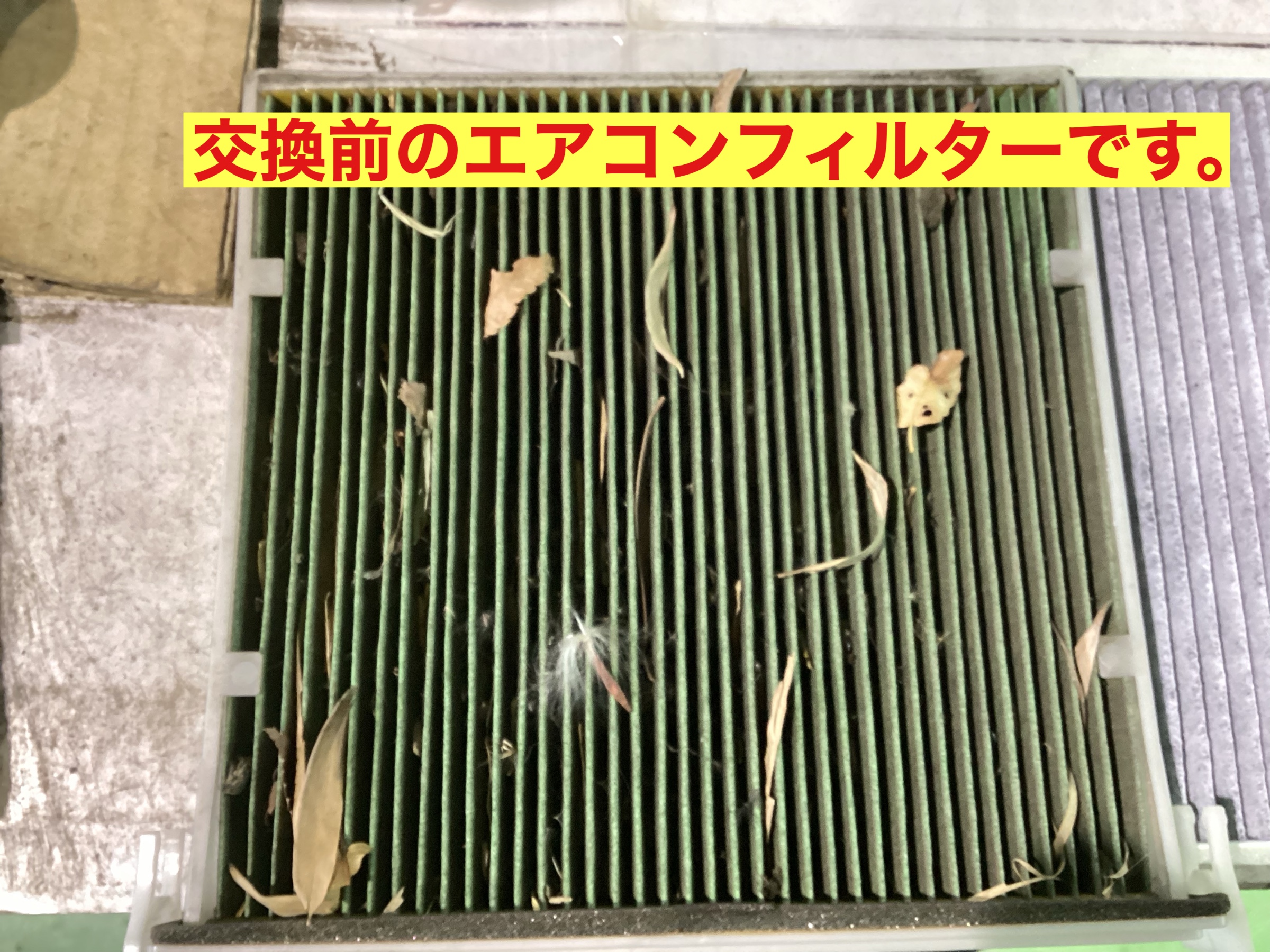 今回点検させて頂いたエアコンフィルターです。車内にホコリや花粉を入れない部品となっております。交換サイクルは1年に1回です。タイヤ館ではエアコンフィルターの点検、交換を実施しております。点検はお気軽にスタッフまでお問い合わせ下さい。
