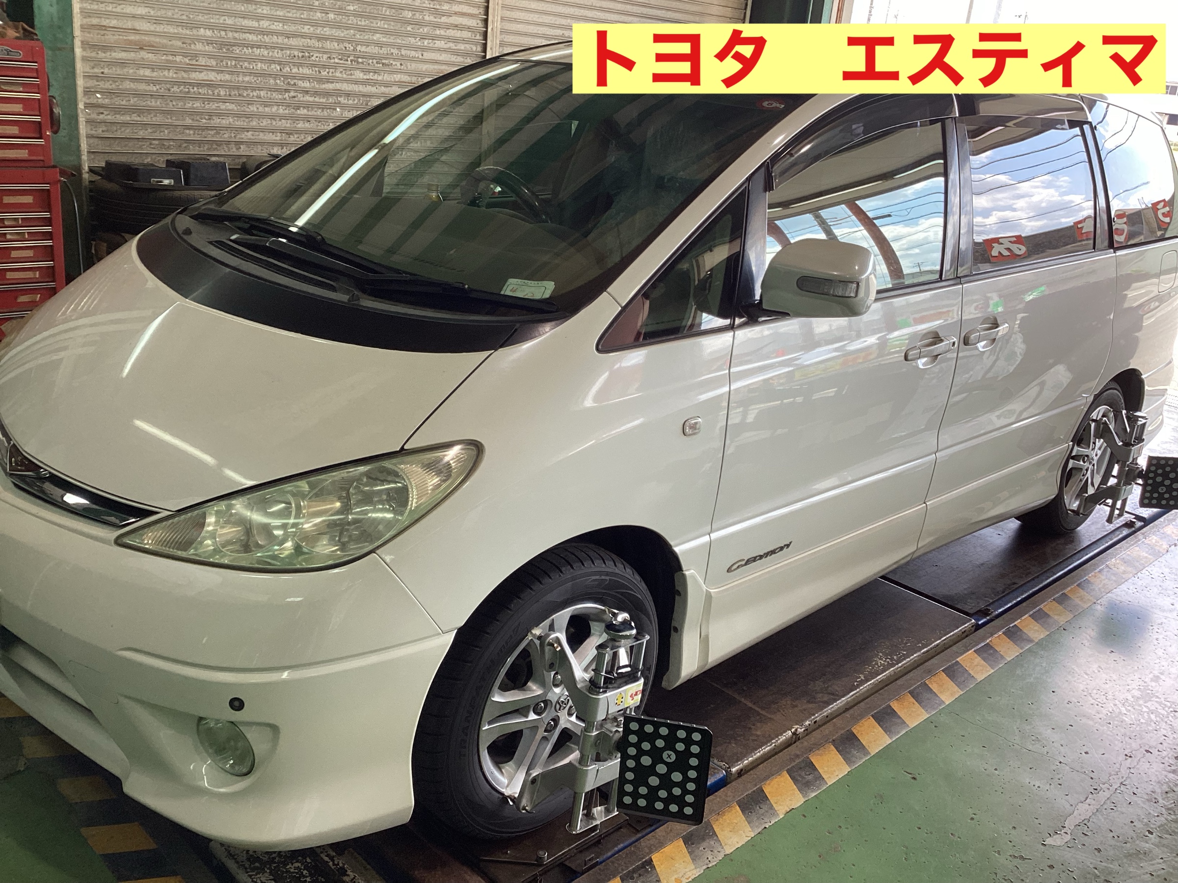 本日ご紹介するのはトヨタ エスティマのアライメント調整です。タイヤが偏摩耗する症状でした
