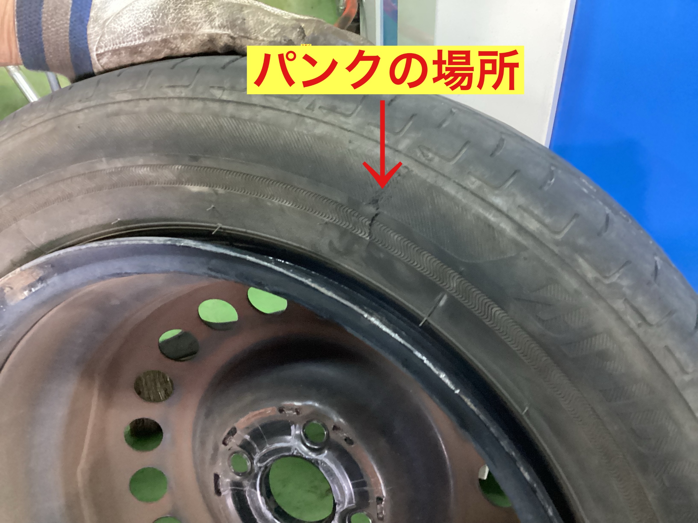 本日ご紹介するのは、ホンダフィットのパンクです。タイヤの内側が裂けてパンクした状態です。