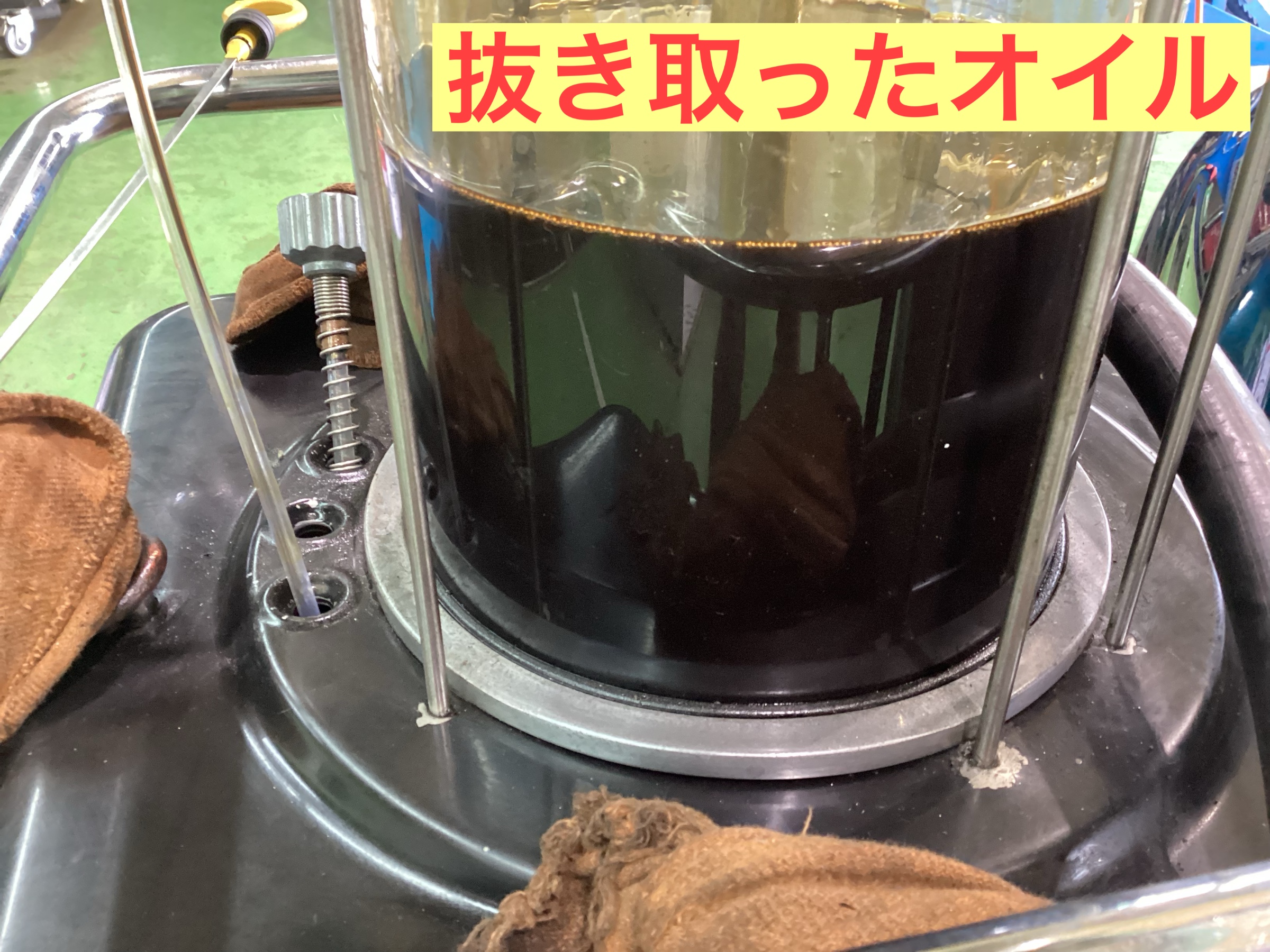 オイル交換の目安は半年もしくは5000キロをおすすめしております。こちらは抜いたオイルの状態です。