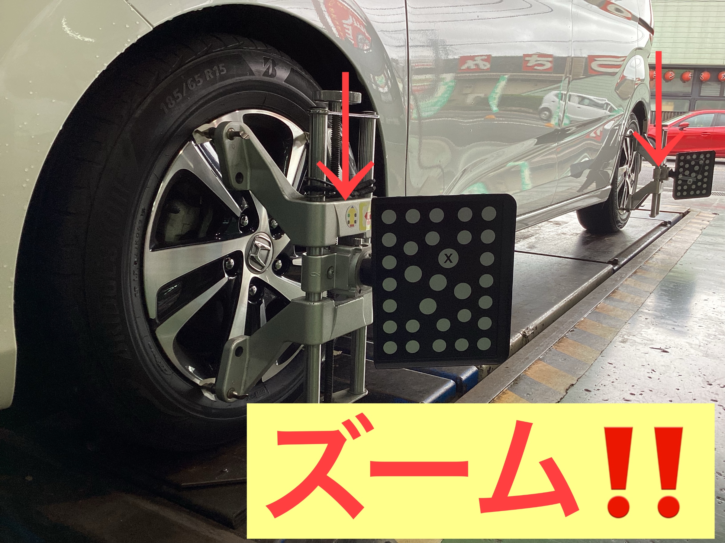 四輪のタイヤにアライメントセンサーを取り付けていきます。近くで見るとこの様な状態です。