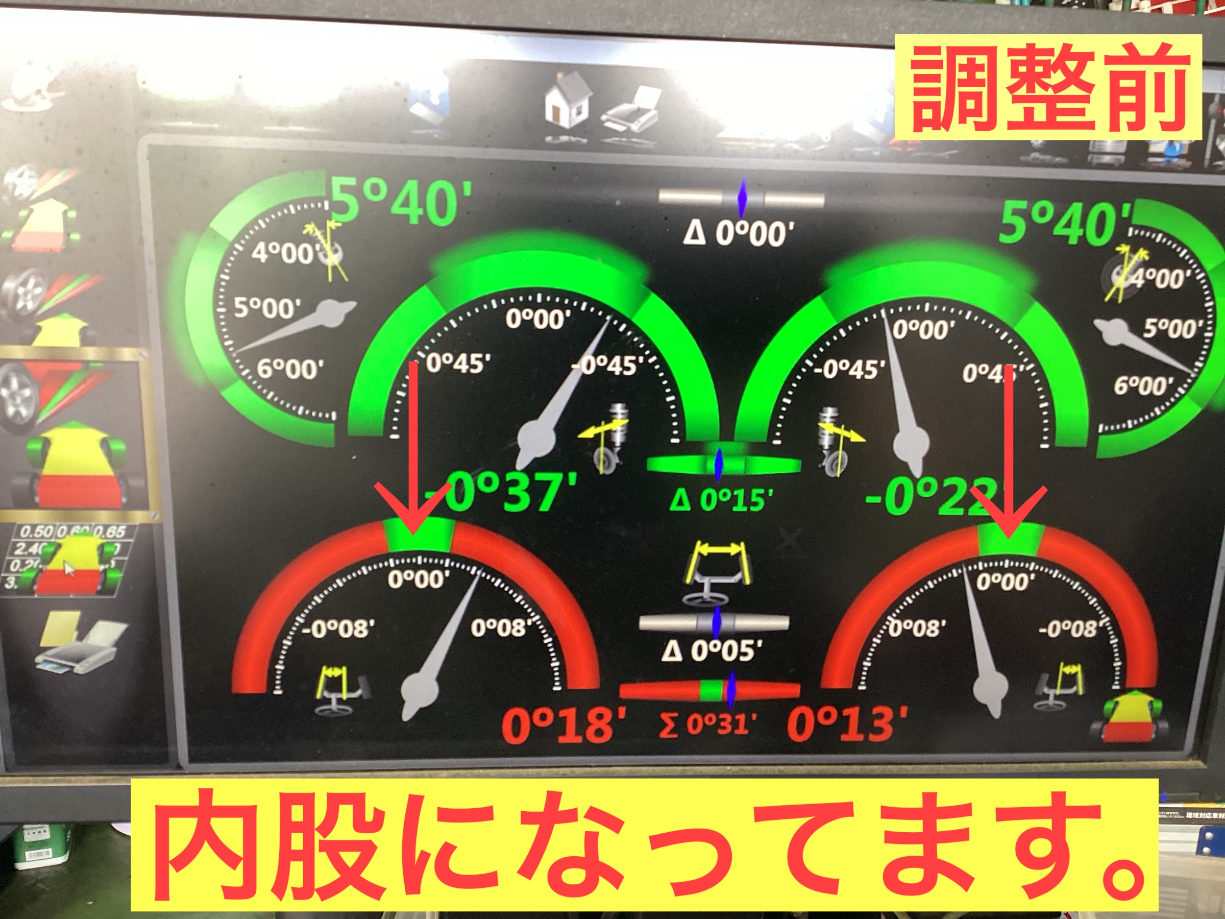 真ん中が基準値になりますが、かなりの内股になっております。このままの状態で運転してしまうとタイヤが偏摩耗を起こし早くタイヤがすり減ってしまいます。では基準値に調整していきます。