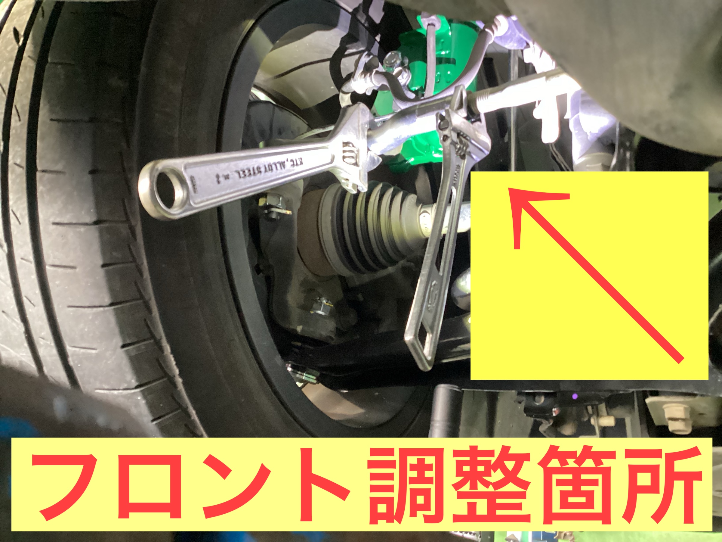 本日のご来店理由は足回りを交換したのでアライメント調整のご依頼でした。一度足回りを分解するとタイヤの取付角度はずれタイヤの偏摩耗、ハンドルのセンターずれ等にもつながります。アライメント調整はタイヤの取付角度を真っ直ぐにし車本来の性能を取り戻す重要な作業なんです。早速作業をしていきます。