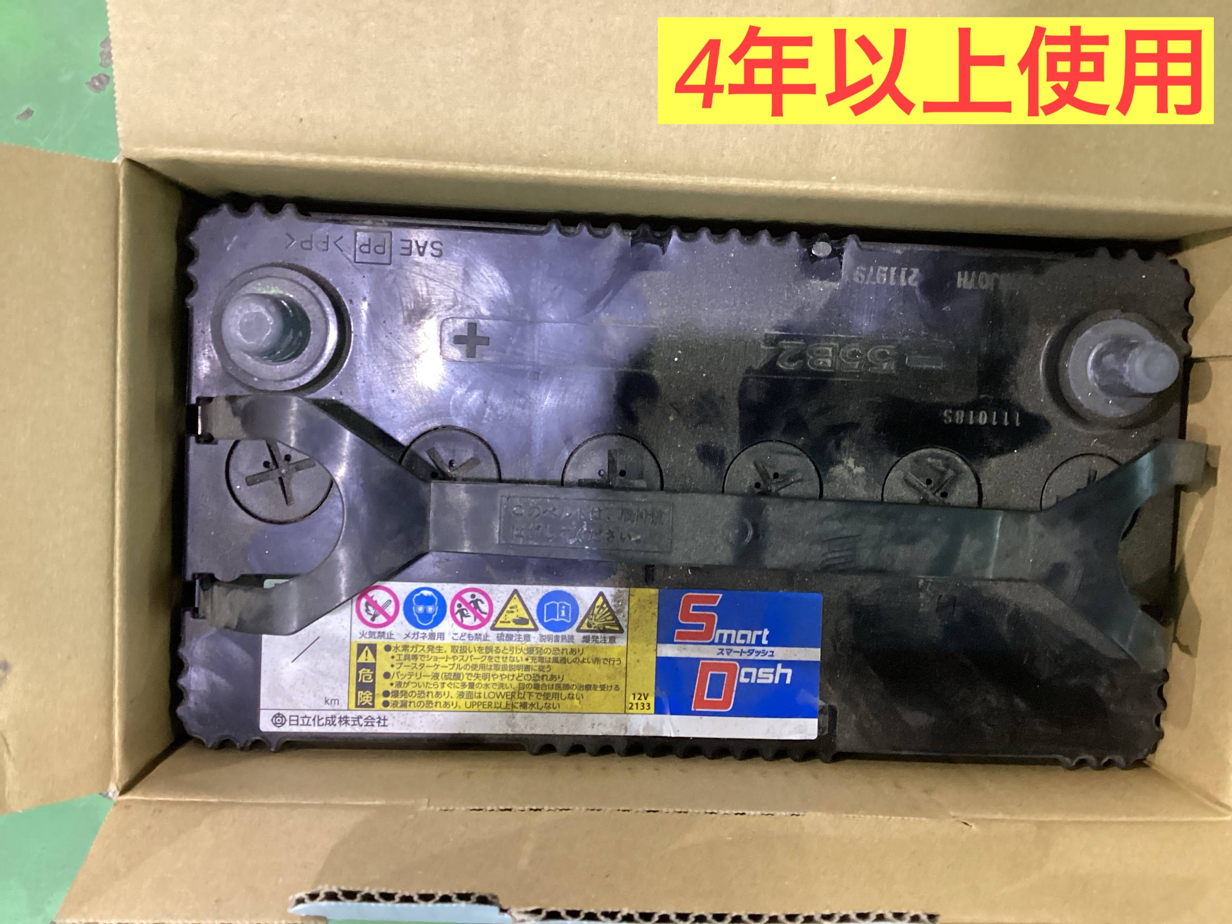 オイル交換でご来店でした。安全点検を実施致しましたらバッテリーが4年以上使用状態でした。ご相談させて頂いき交換となりました。