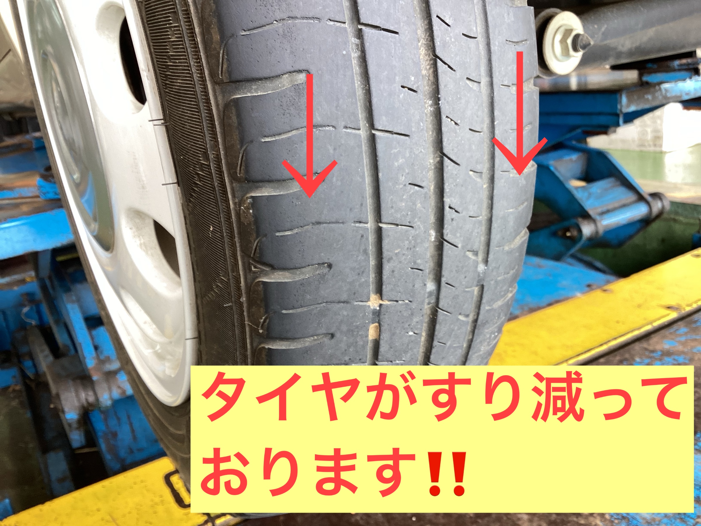 オイル交換作業を実施しながらタイヤの空気圧点検中の事です。タイヤの溝がすり減っているのを確認しました。