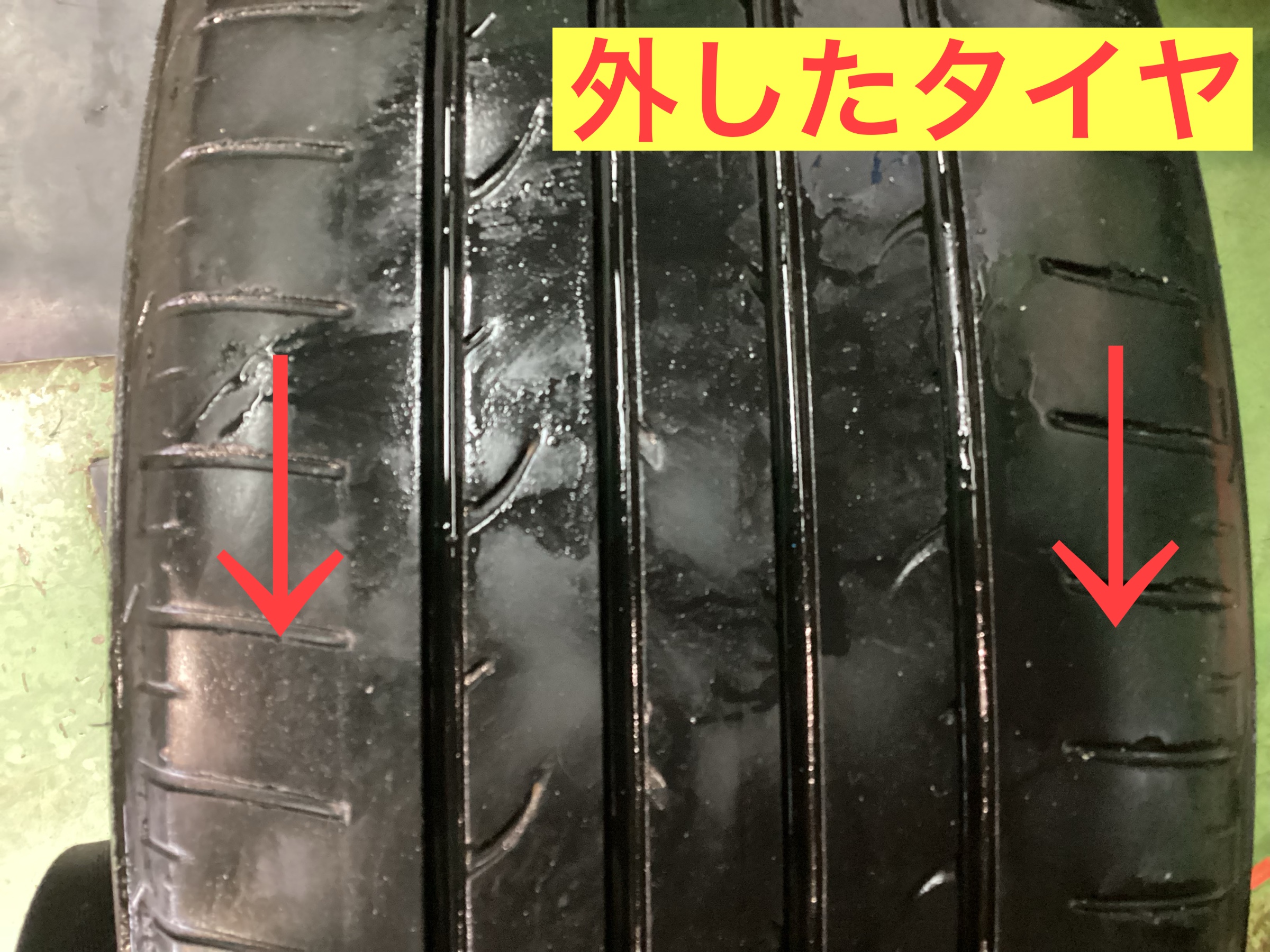 タイヤの内外側はすり減り中溝は2、5ミリと雨の日の運転を考えると滑りやすい状態でした。ご相談させて頂き以前交換した同じタイヤで交換致しました。