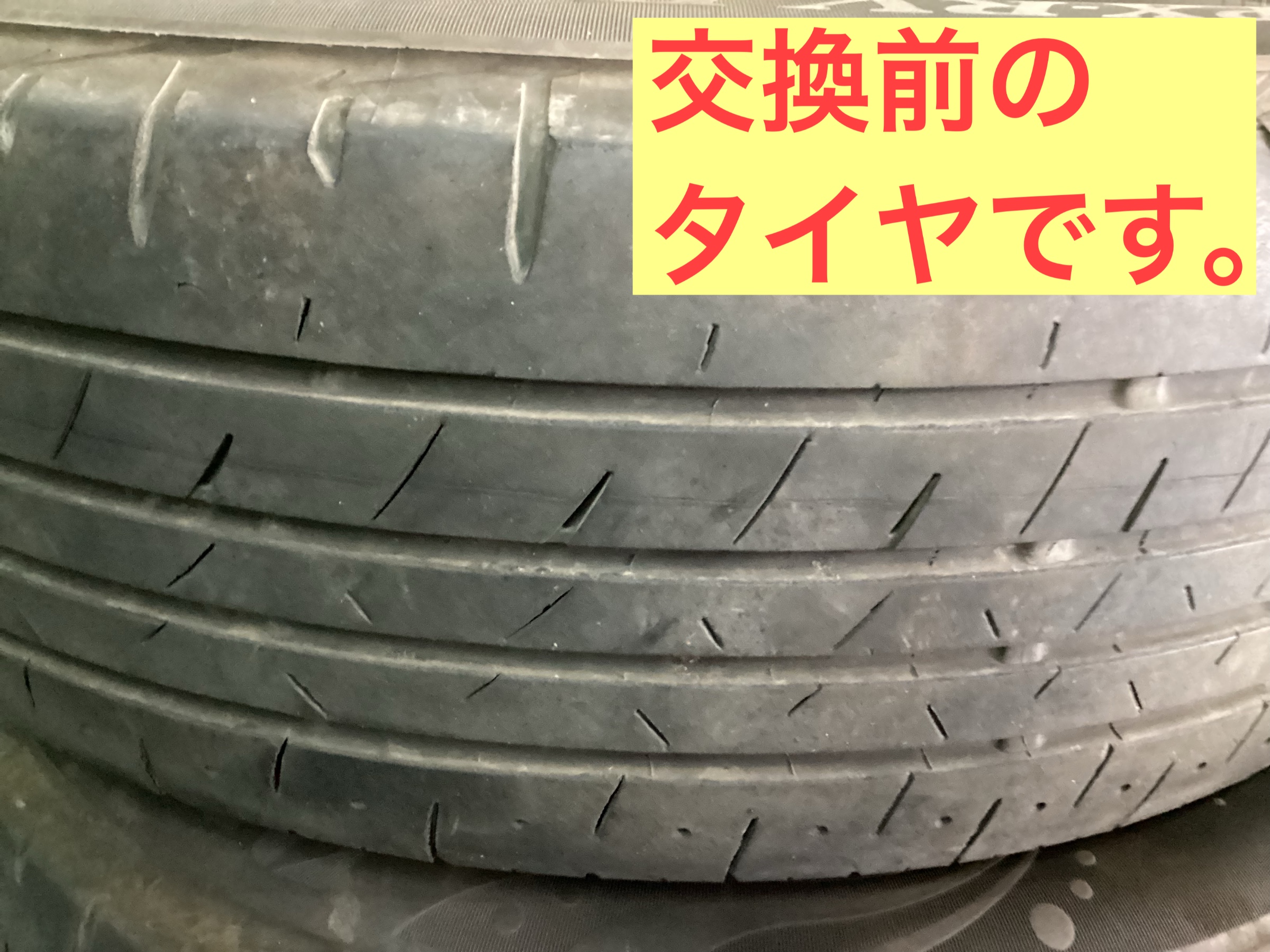 今回、ご来店頂きましたお客様は定期的にタイヤ交換を実施して頂いております。タイヤの交換目安は年数で4年タイヤの溝が半分を使用したを基準にご案内しております。新品タイヤの溝は約7、5ミリです。交換前のタイヤはこちらです。