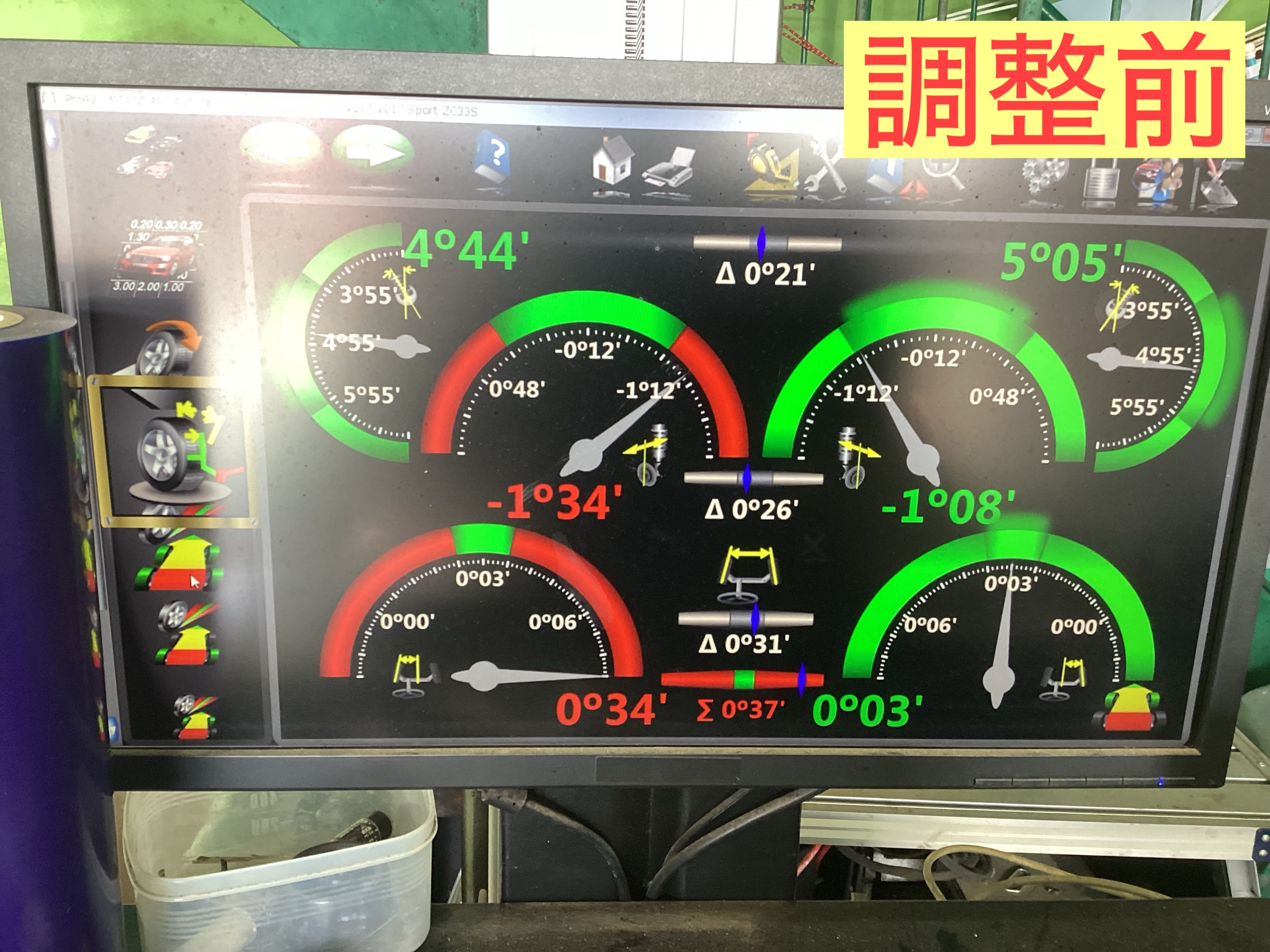 本日、スズキスイフトスポーツのアライメント調整をご紹介致します。前回バッテリー交換をご紹介した続編となります。今回、ダウンサスを入れられて当店でアライメントのご依頼でした。では測定をかけてまいります。