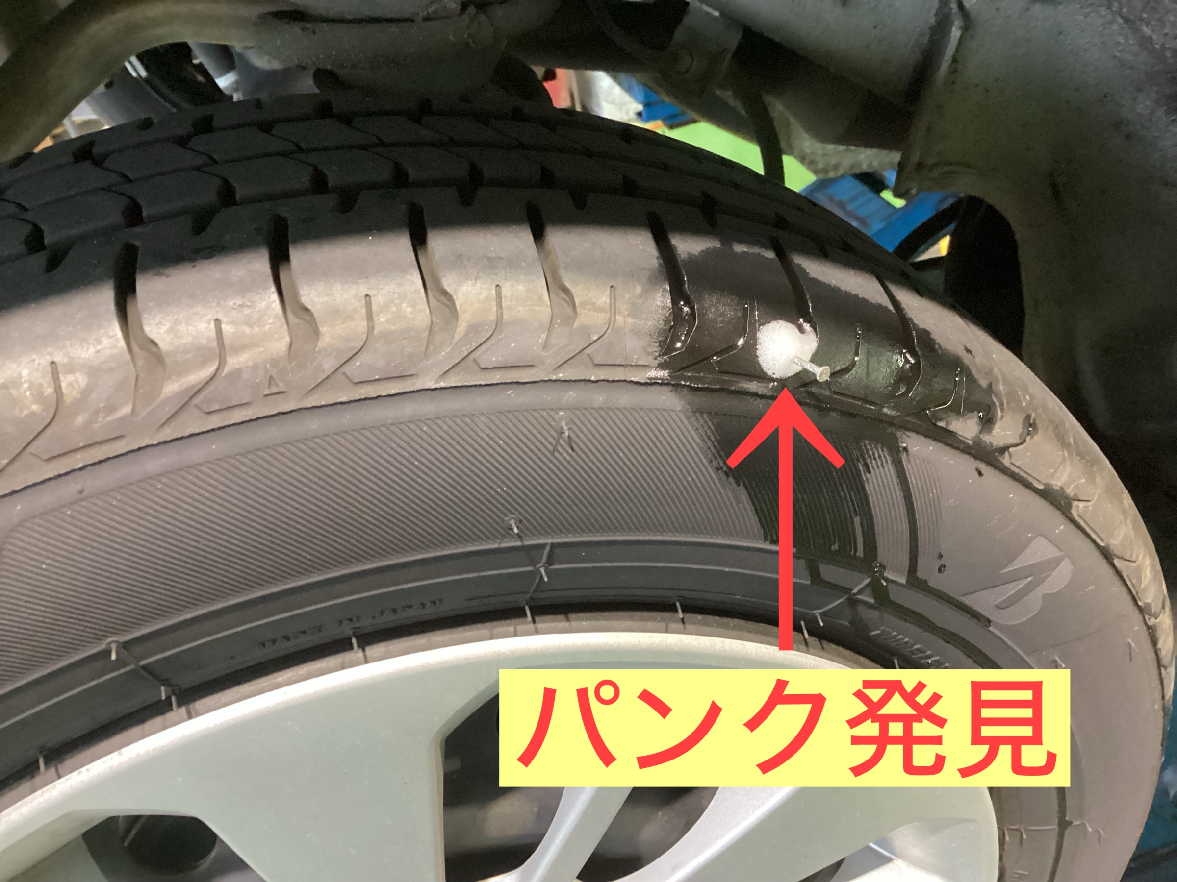 数ヶ月前に新品で4本交換頂いたお客様で何かが刺さっている‼️ということで点検を実施致しました。