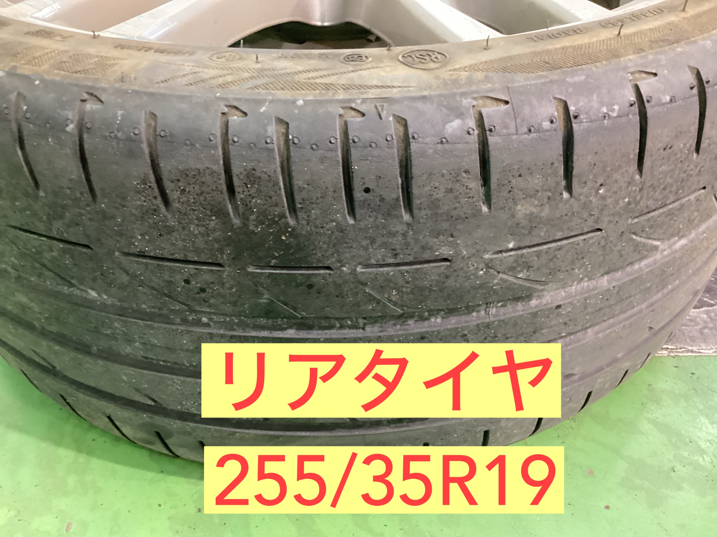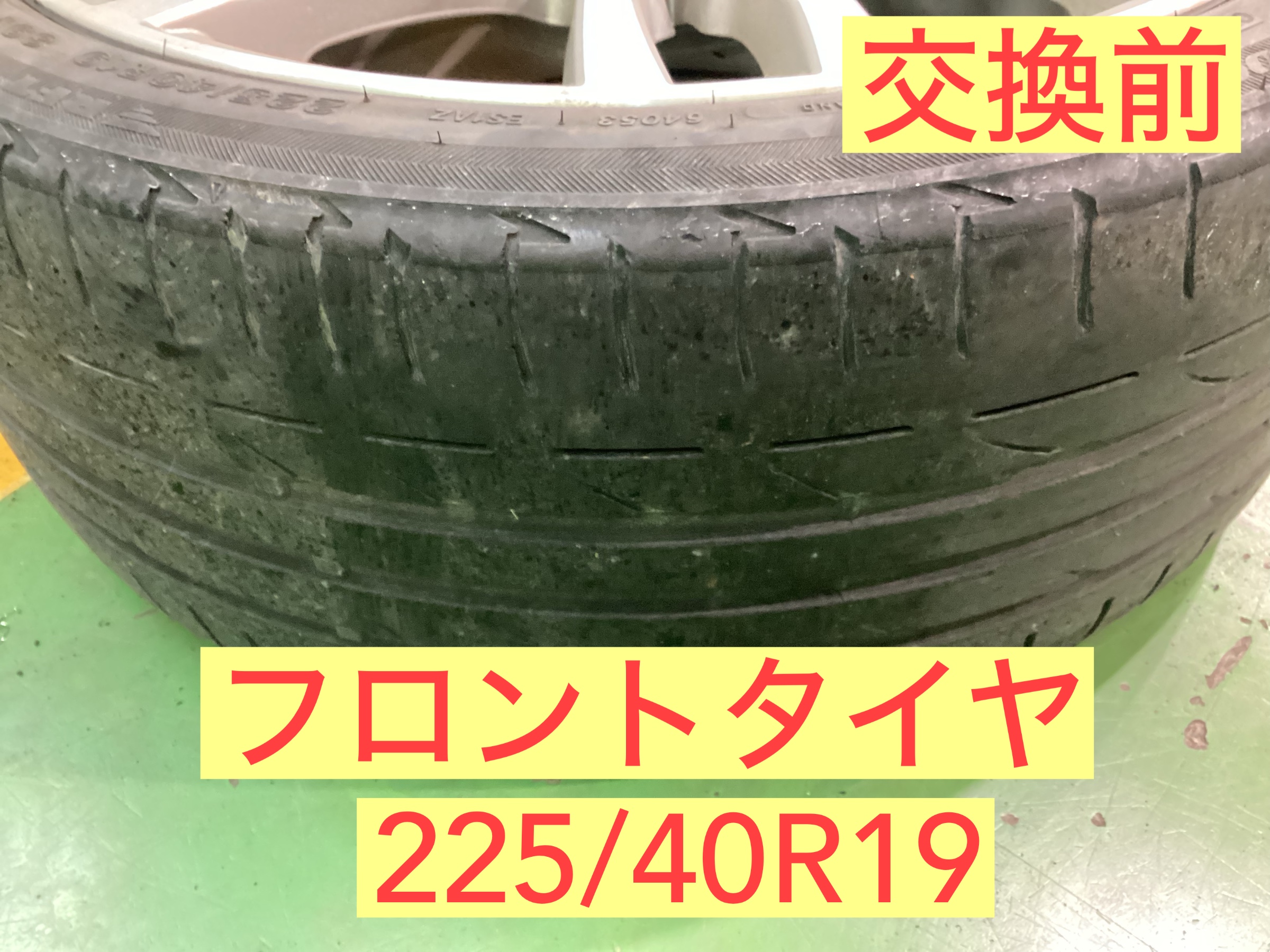 特にフロントタイヤがすり減っているのが目立ちます。タイヤの交換サイクルは新品溝に対し半分以下、もしくは4年以上使用している場合、性能が低下してきますので目安としてご案内致します。