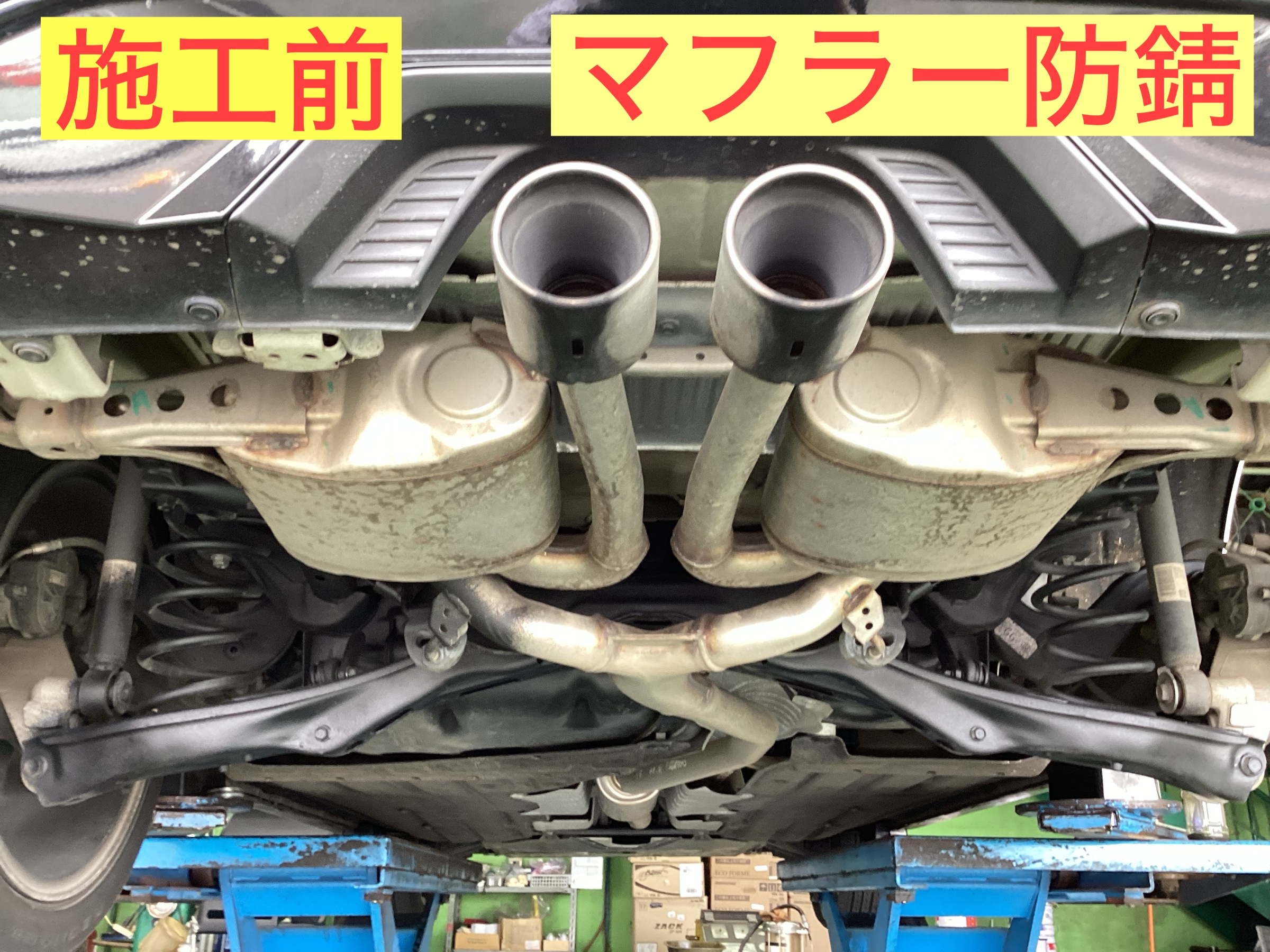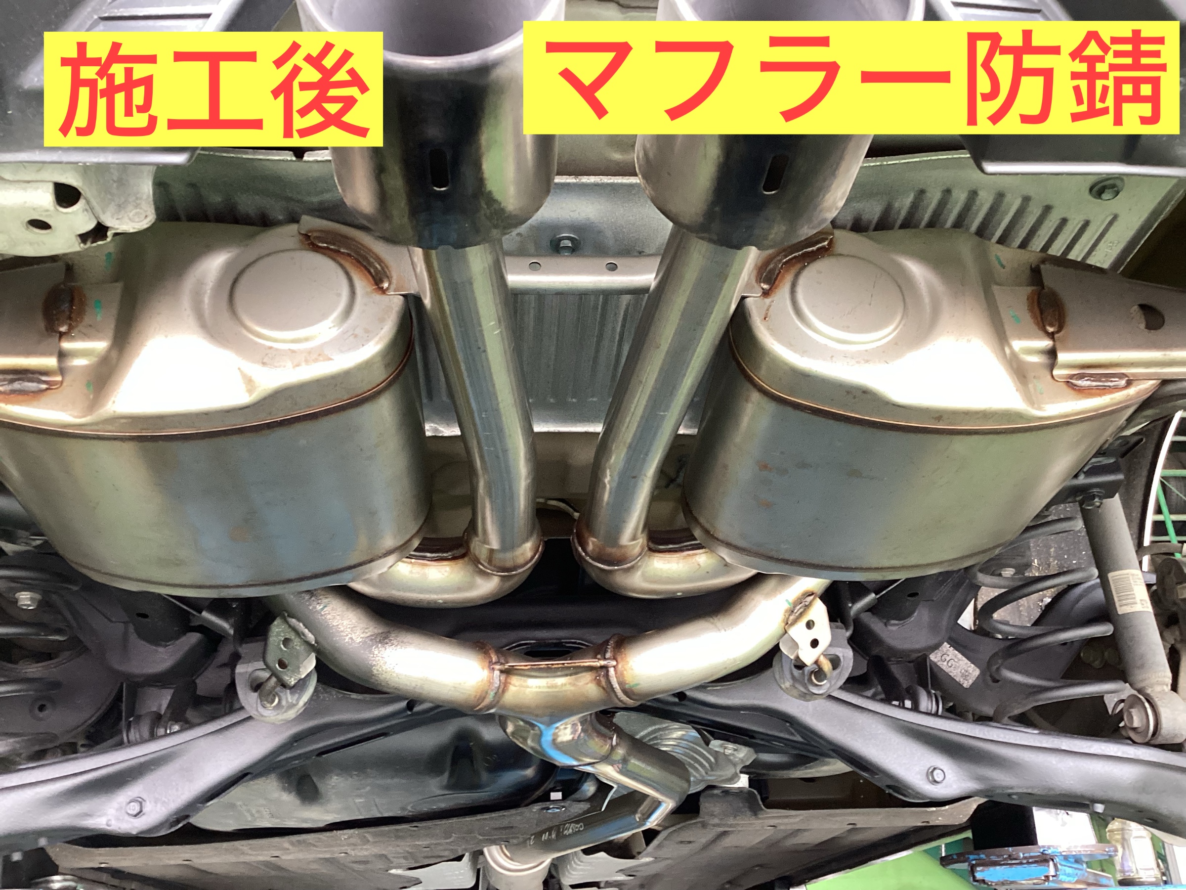 サビをワイヤーで除去後、錆転換剤で黒くなります。そこへ通常の防錆剤施工で防錆効果をさらに向上しました。黒いです。‼️そして、定番で実施しているマフラー防錆