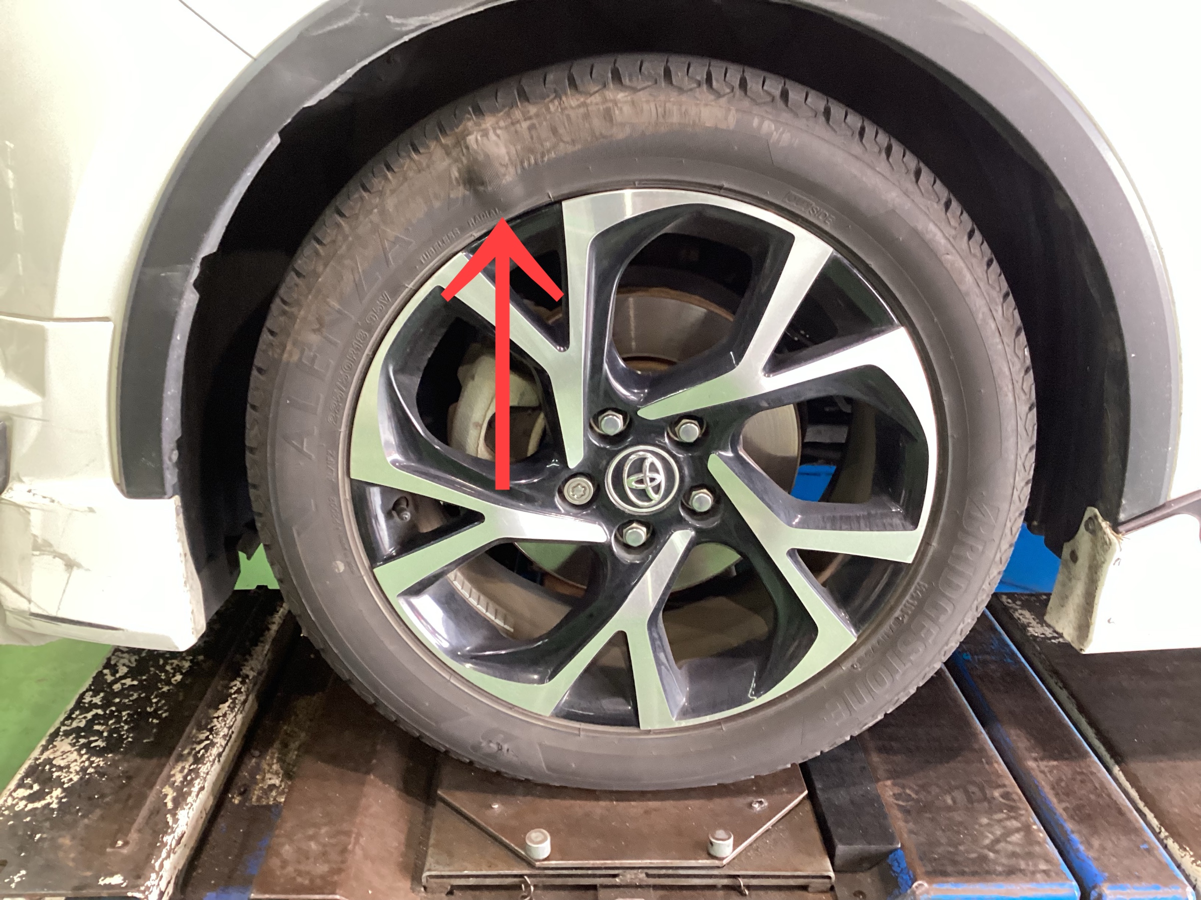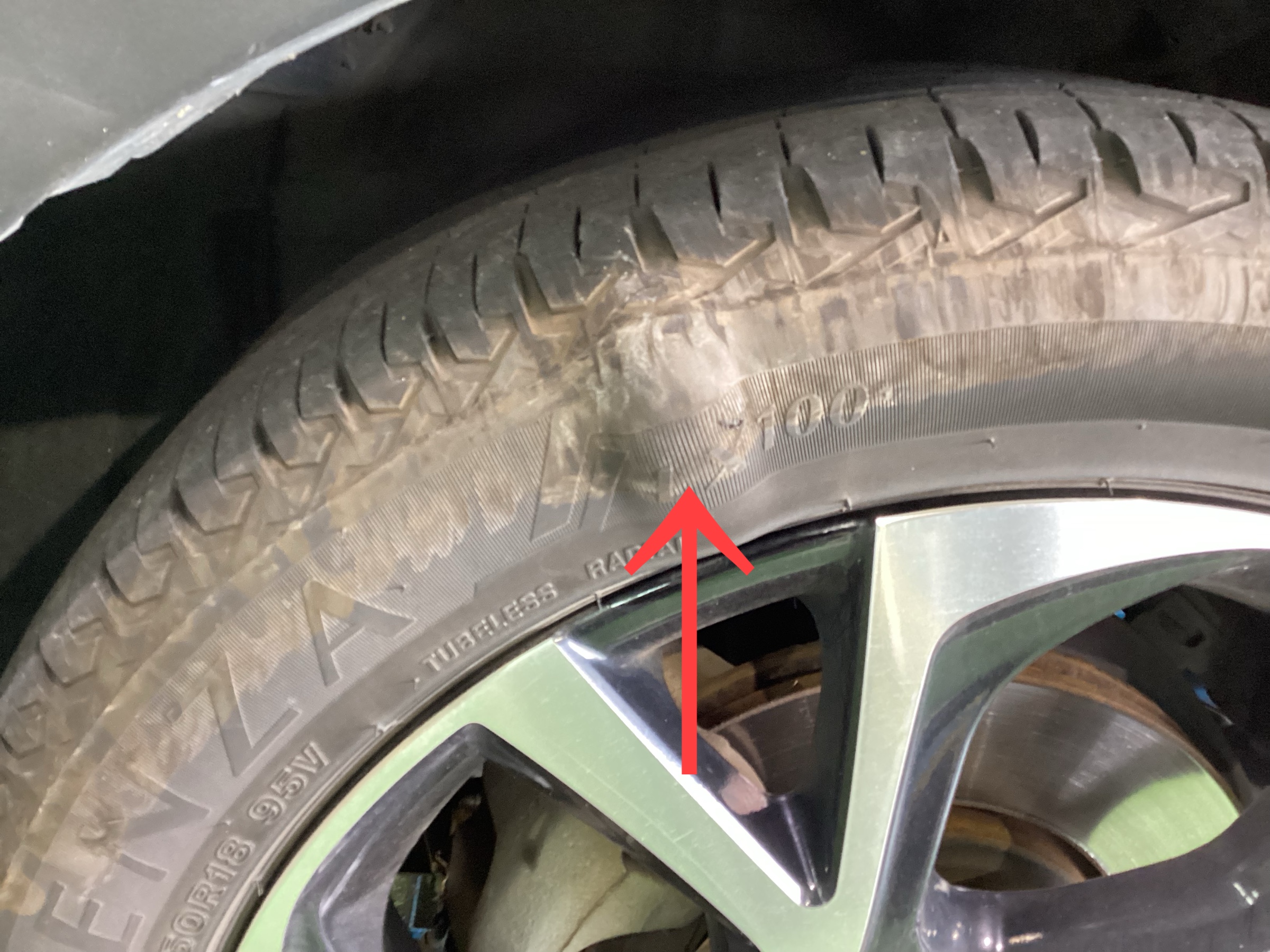 本日は、タイヤのトラブルのご紹介です。確認するとタイヤのサイド部がコブ状に変形しておりました。