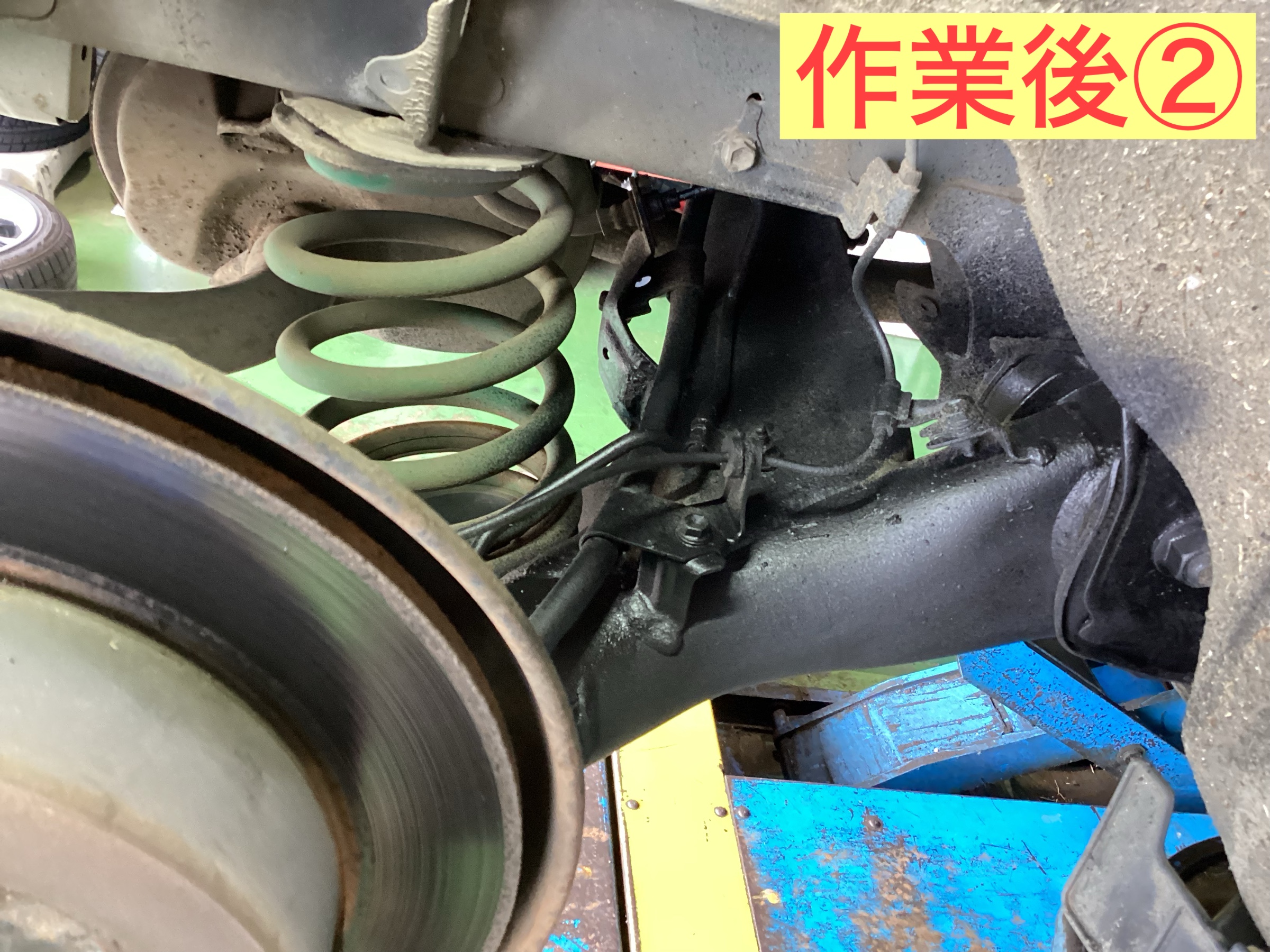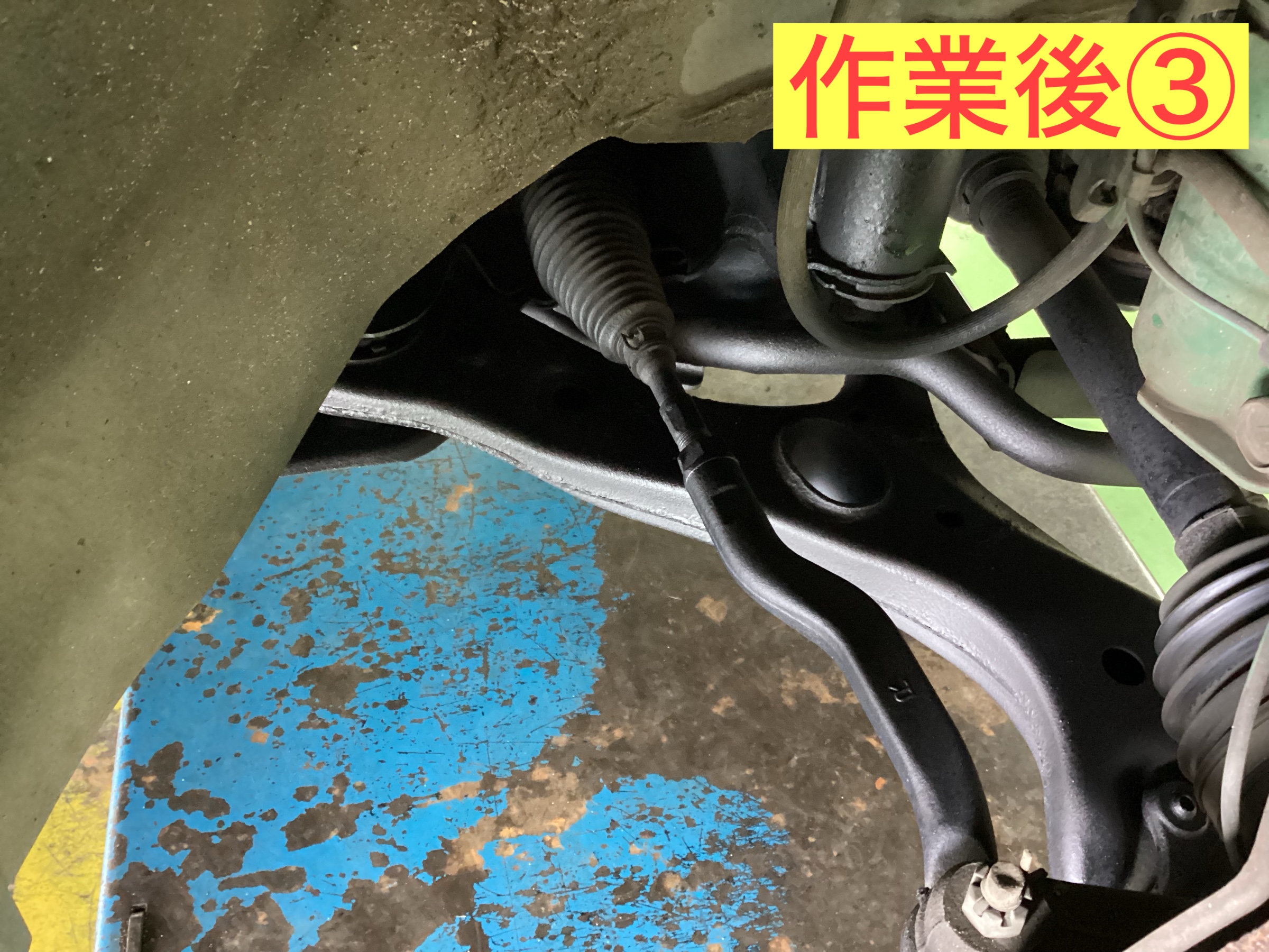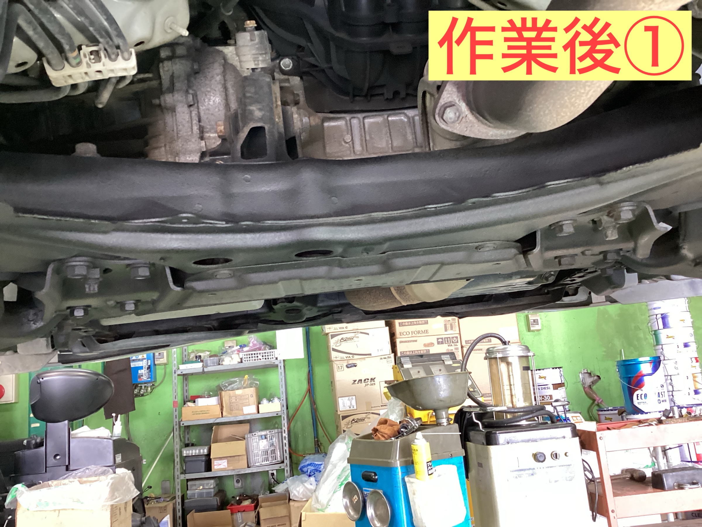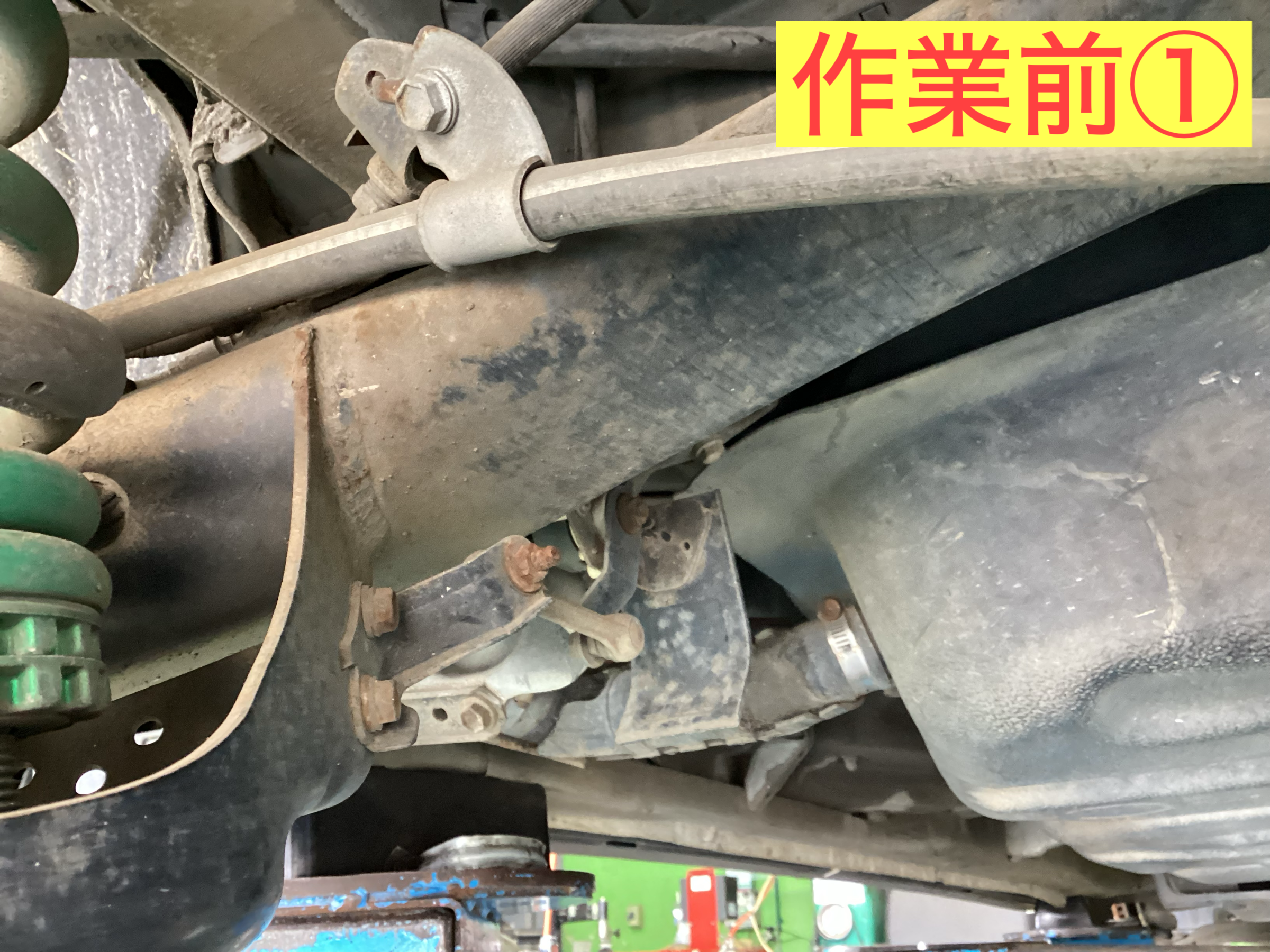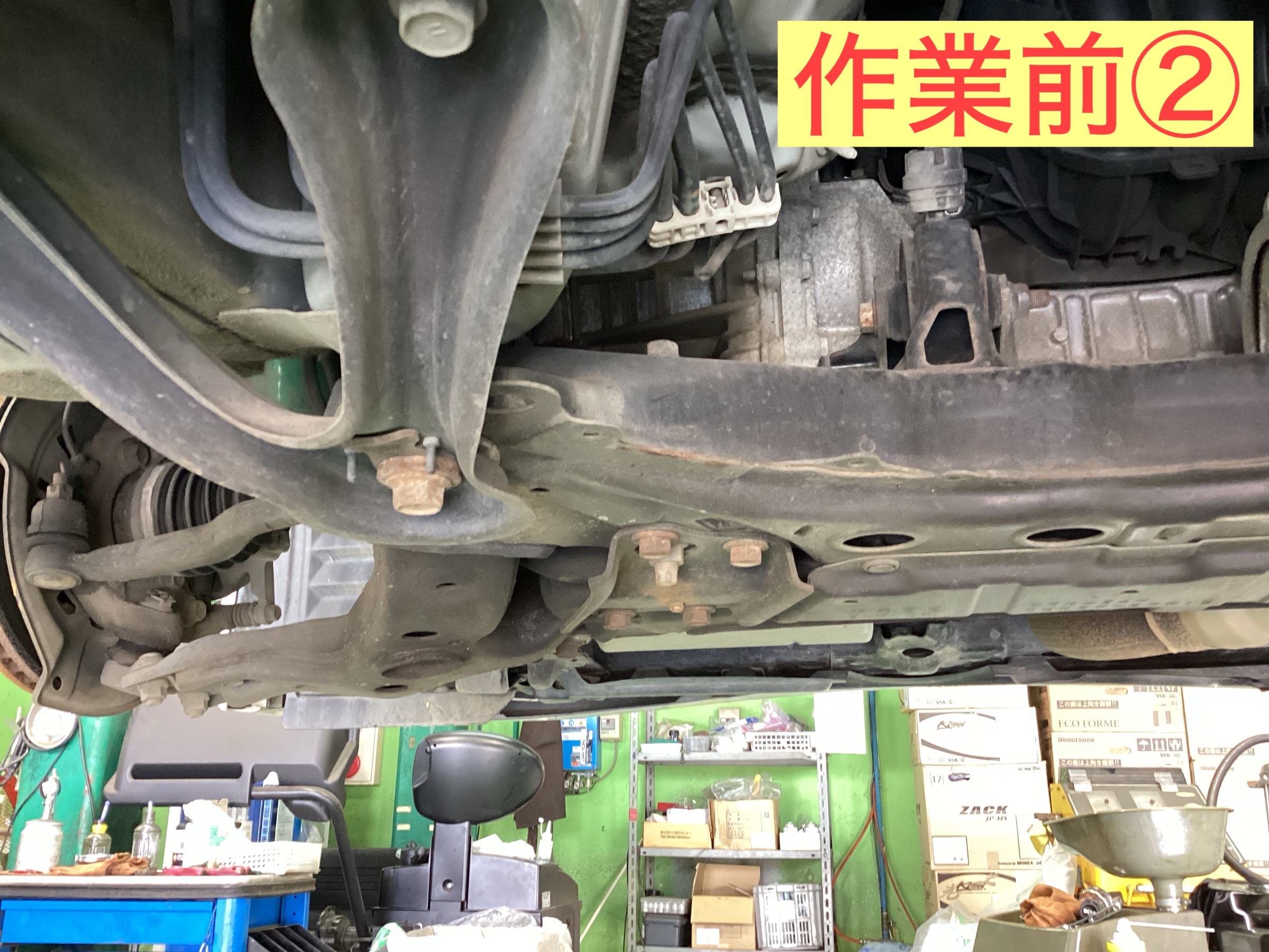 従来の防錆コートは一年の定期的な施工を実施しておりました。今回は、新商品のアンダーボディーエクストラの施工となります。作業前はこちらです。