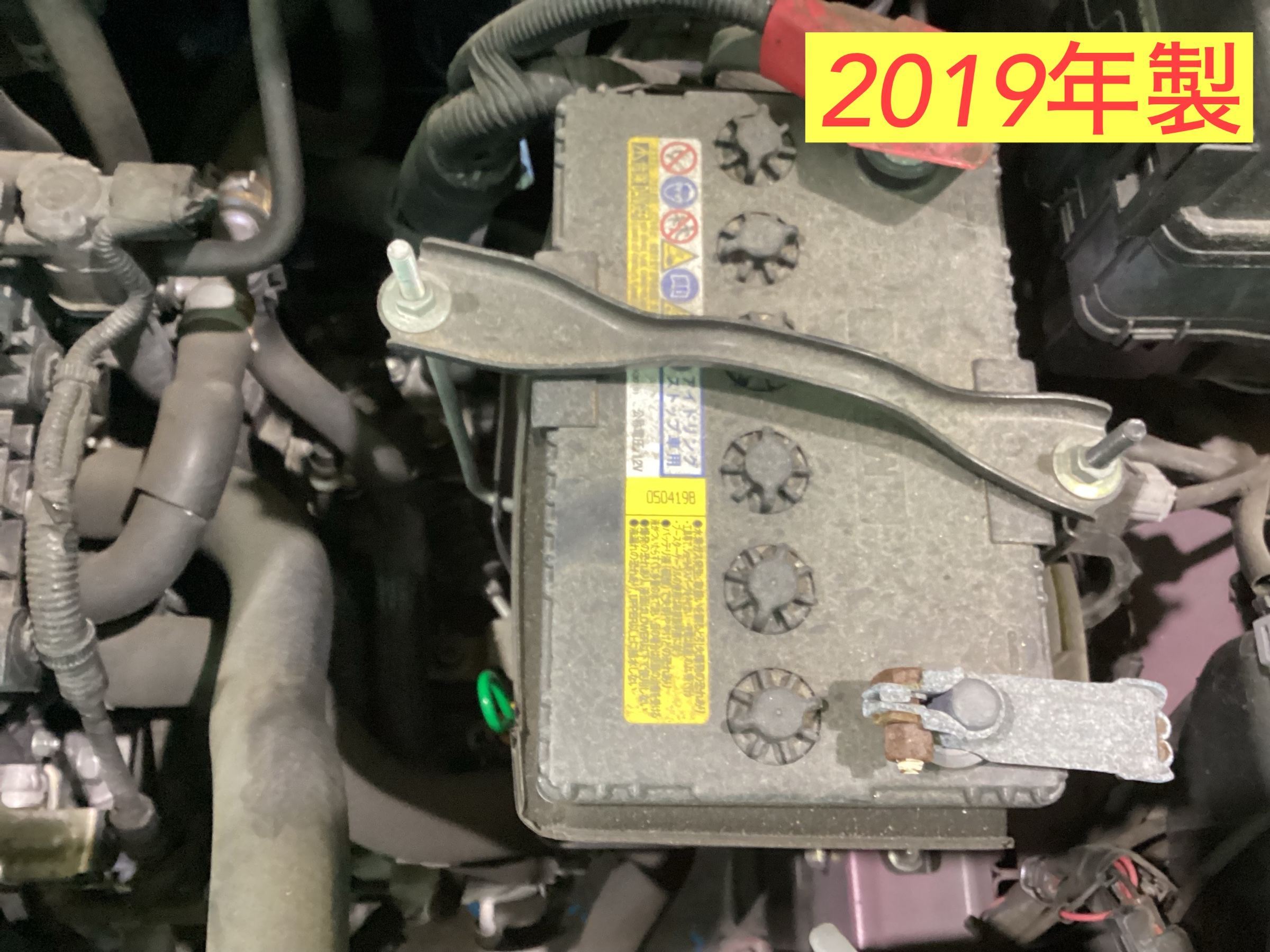 オイル交換でご来店頂きました。安全点検を実施させて頂きバッテリー使用年数が5年目の状態でしたのでご説明させて頂き交換致しました。交換前はこちらです。