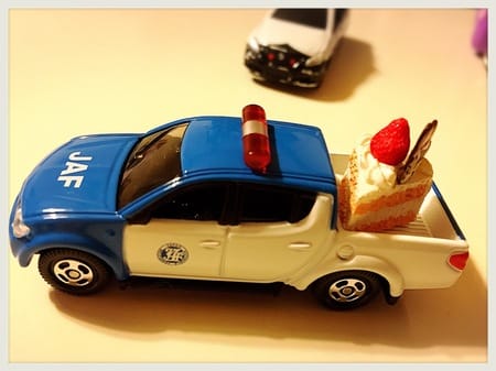 なんとも不思議な遊びをするので、疲れた私は途中で、JAFのトミカにケーキを乗せてあげたらとてもよろこんでくれて(謎)、パトカーの警護までつけてくれました・・・写真2枚目(。・w・。 )