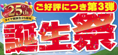 大好評の「タイヤ館誕生25周年♪誕生祭」第3弾が開催中です*。(b・∀・b)。*゚