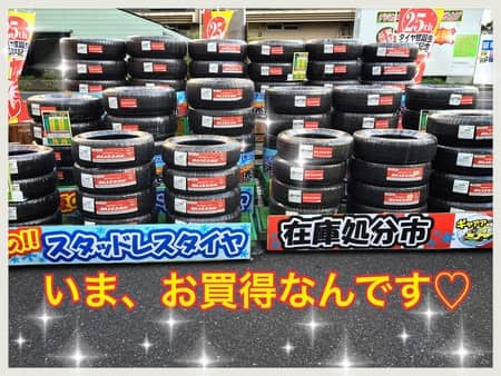 写真1:たくさん並んでるのは冬用タイヤ!現在、在庫処分市を開催中です♪