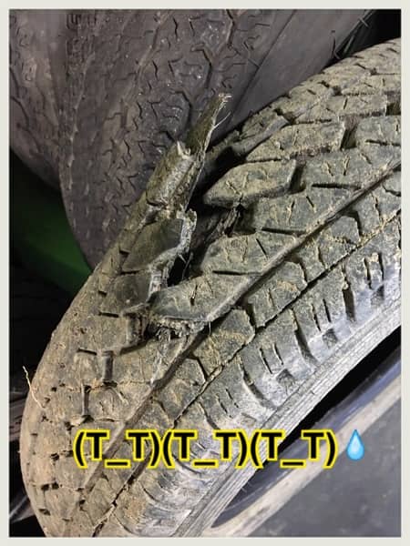 写真1:春以来、久々にトラック動かしたらパンクした!とお持ちいただいたタイヤです。