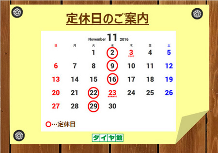 写真2(中):当店の「11月」の定休日カレンダーです!いつもと違って「火曜日」に「定休日」があります◟(⚫͈ω⚫̤ )