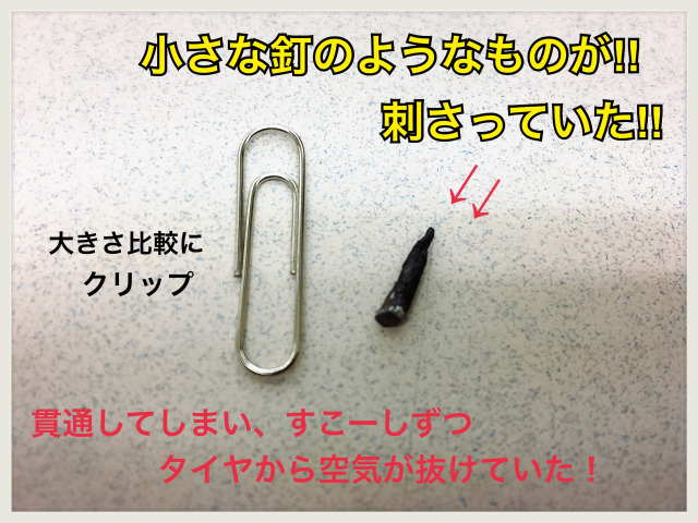 タイヤ4本のうち1本のタイヤだけ空気圧が低い?!というところから、パンクかな?と疑いがかかり、よーく点検すると!!「あっ!なにか刺さってるΣ(゚ロ゚;)!釘っ!!Σ(゚ロ゚;)」とパンクが判明することがあります。