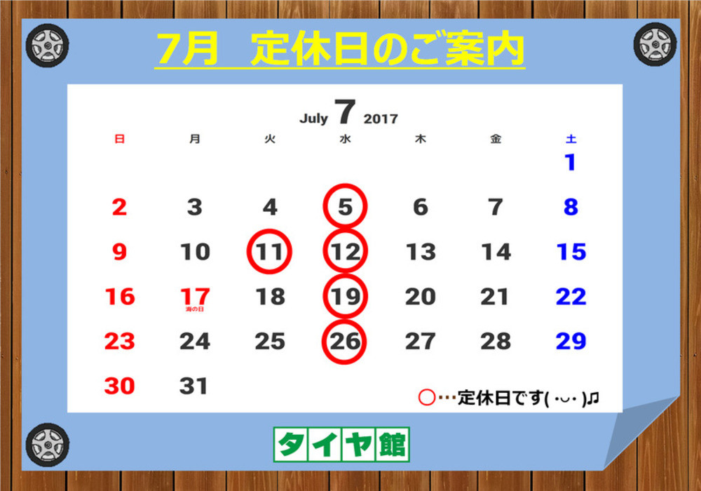 作業のご予約やお出かけ前のタイヤ点検など、下記カレンダーをご参照ください。