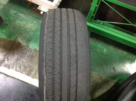 走行距離は約10万キロ程。日々の走行の中でのズレが溜まりタイヤの角度は、がに股