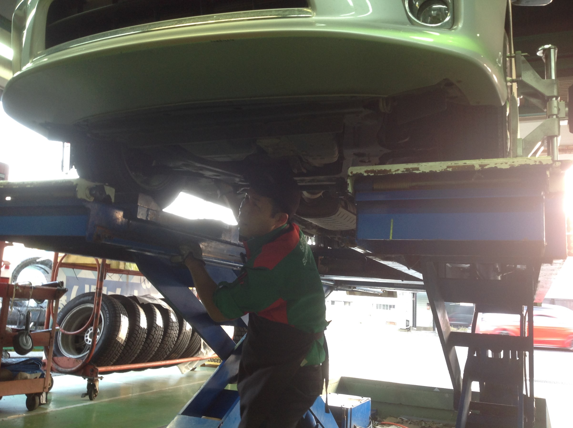 - 車を持ち上げ、下からタイヤの軸を調整していきます。