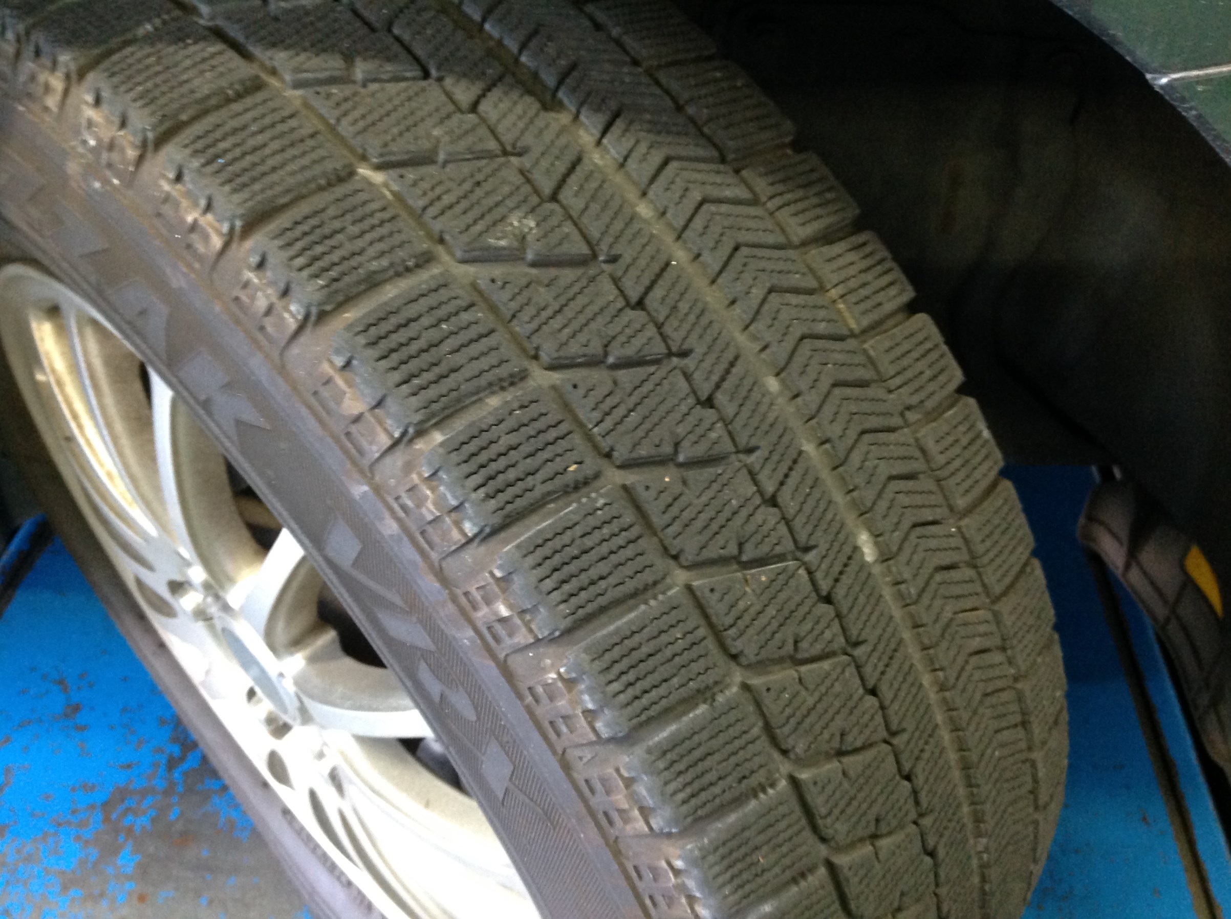 夏タイヤへ履き替えの祭にスタッドレスタイヤの状態を確認しています。