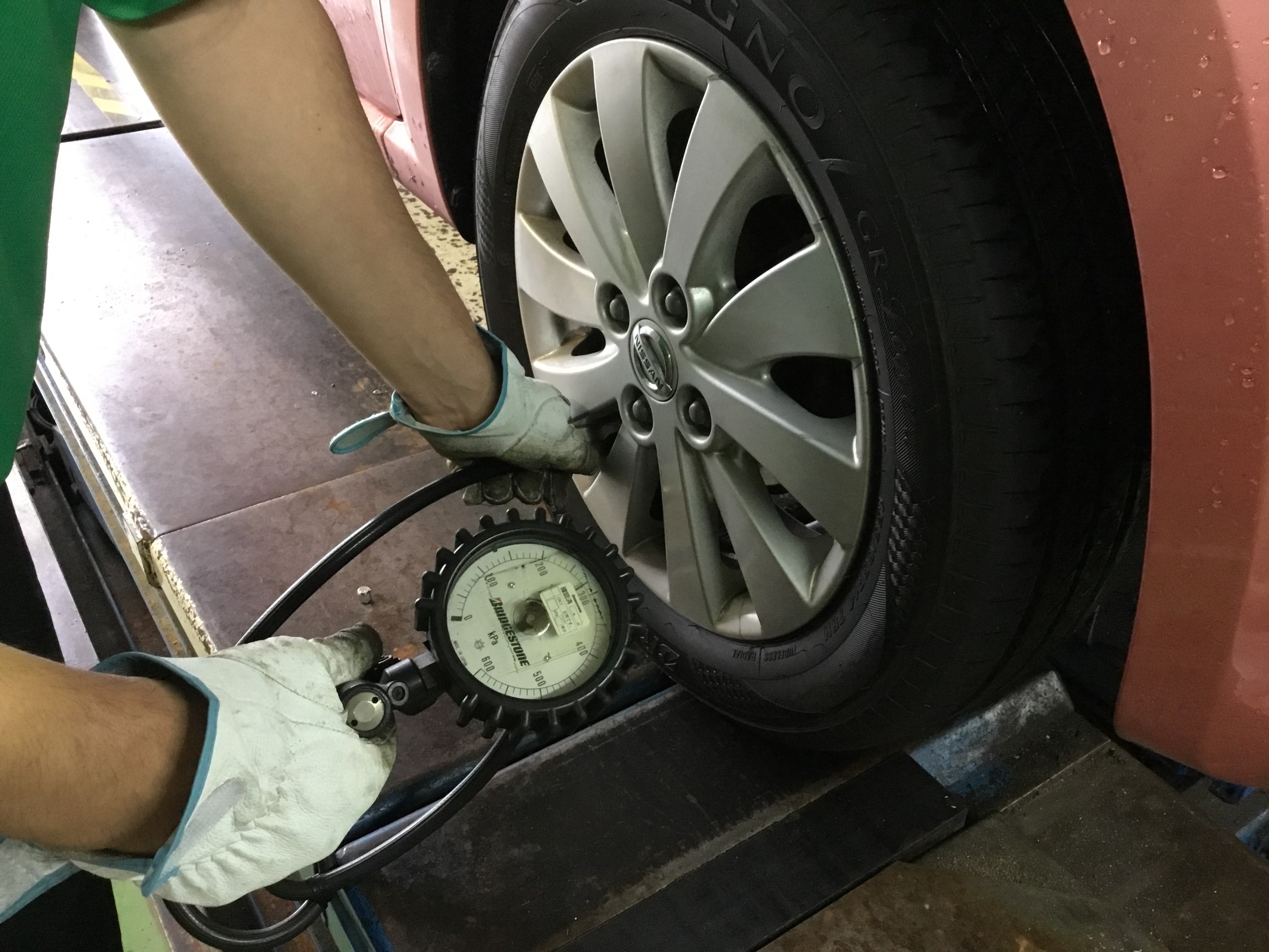 空気圧不足のまま走行すると異常摩耗の発生や燃費悪化につながるため、測定し、調整いたします。