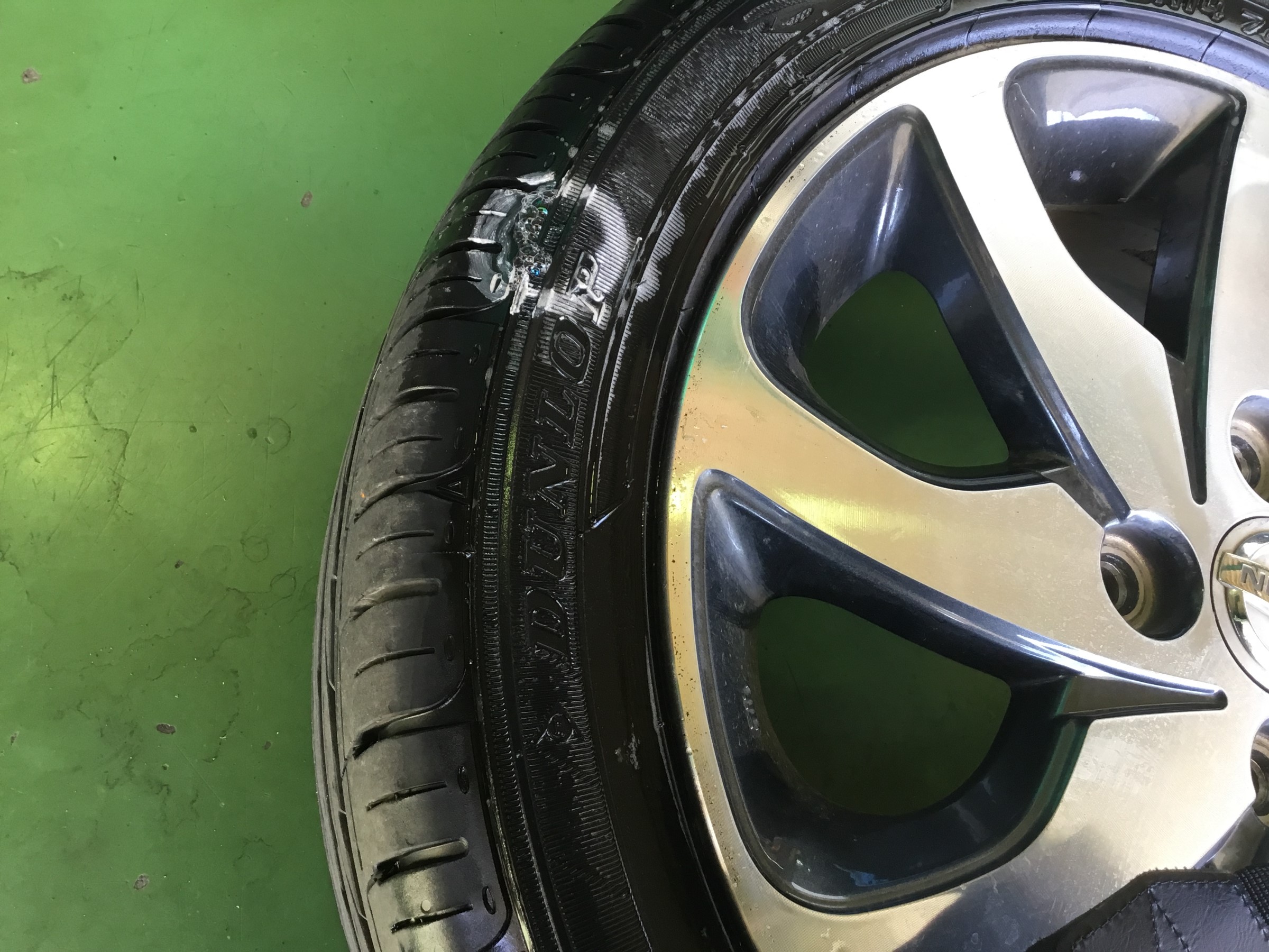 タイヤのサイドに近いショルダーの部分がパンクしてしまっていました><