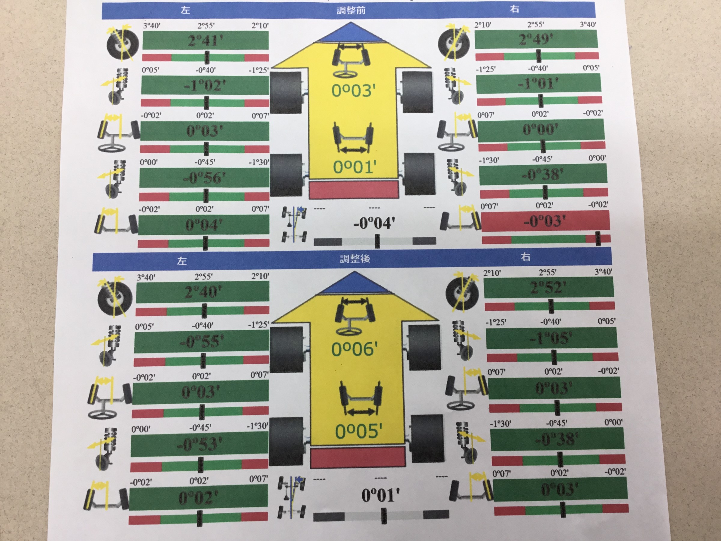 アライメント測定をした結果右の後ろが外を向いてしまっていたので規定値に調整しました♪