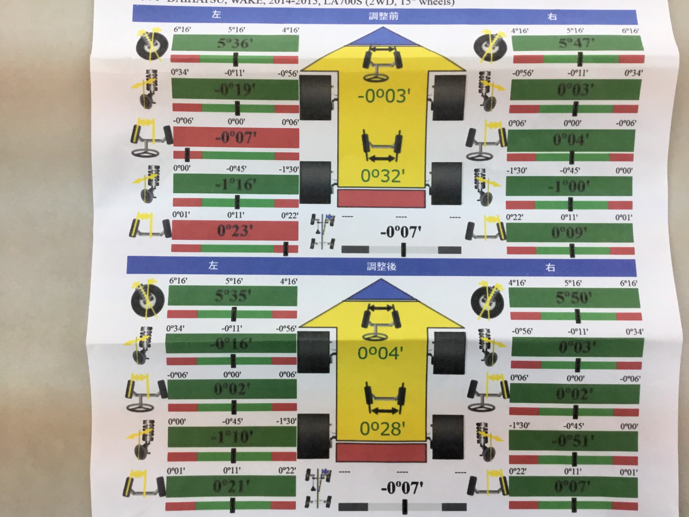 測定の結果左前のトウ角が外を向いていたので規定値への調整を行いました!!