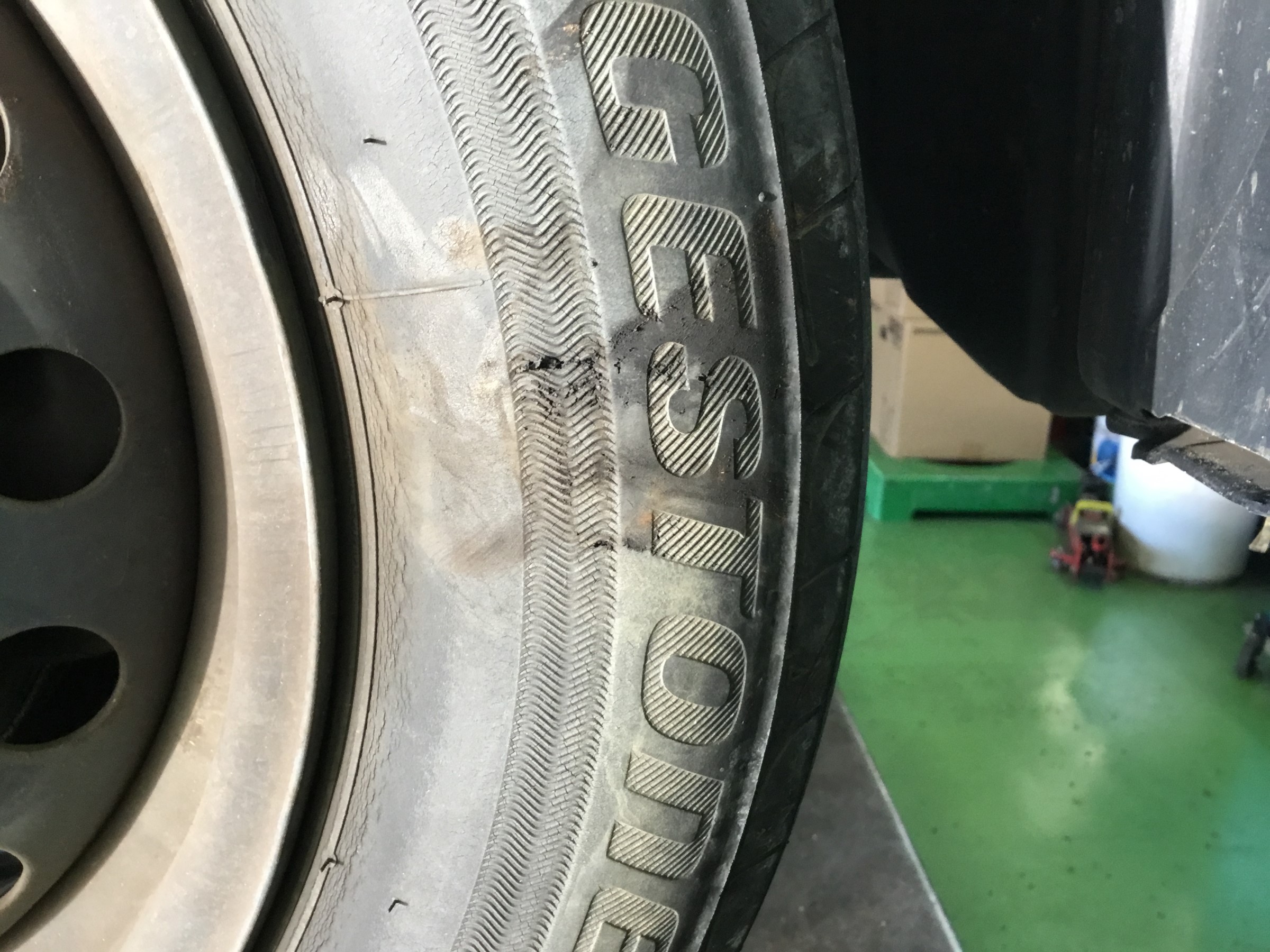 走行中気づかず倒れたはしごを踏んでしいタイヤの横に傷が入ってしまっていたため、