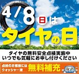 4月8日はタイヤの日!! タイヤの日に向けて、本日より無料安全点検を実施して頂いたお客様には ウィンドウォッシャー液を無料補充してます。 花粉や黄砂が舞いやすい時期にはウィンドウォッシャー液が大活躍。 ぜひ、この機会にご来店下さい。 スタッフ一同、お待ちしております。