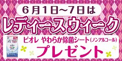 今月も好評のレディースウィークも本日が最終日です。 あれば便利な「ビオレやわらか除菌シート」をプレゼントしております。 まだまだプレゼントの在庫はございます。 この機会をお見逃しなく! 対象者は商品購入者とさせていただきます。