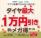 みなさまこんにちは( ・◡・ )♫ 先月から開催中の【秋のメガ得セール】は、早くも明日31日(月)が最終日となります!! 【秋のメガ得セール】期間中は、タイヤ館アプリをダウンロードで、もれなく最大1万円引きとなるタイヤ割引クーポン※を配信しております!! ※タイヤサイズ:~14インチまで3,000円OF...