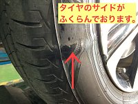 本日、空気圧調整でご来店頂き発見致しました。 タイヤのサイドが膨らんでおります。お客様に確認しましたら縁石にぶつけたという事を確認致しました。この状態での運転は大変危険です。ご相談させて頂いて交換する事になりました。足回りの点検でアライメント調整も実施致しました。タイヤのご相談...