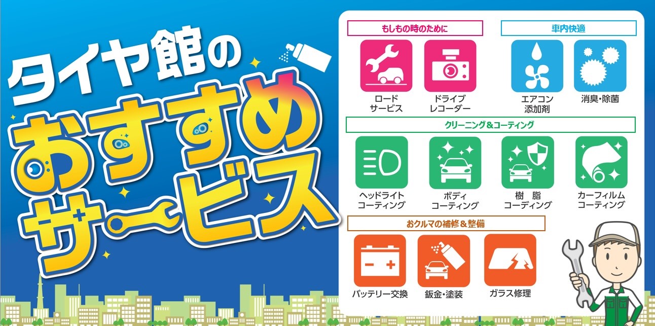 タイヤ・ホイール・オイル交換・ワイパー・バッテリー・パンク修理