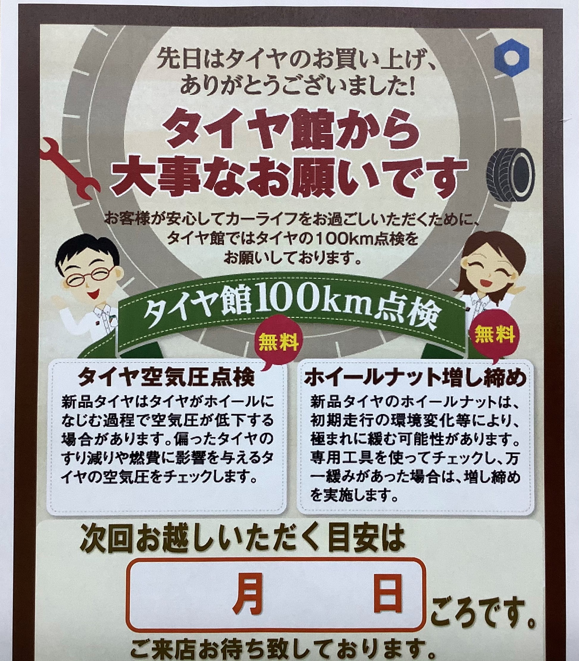 この点検はタイヤ交換と新品のタイヤを取り付けした、お客様に点検のご案内をしています!!