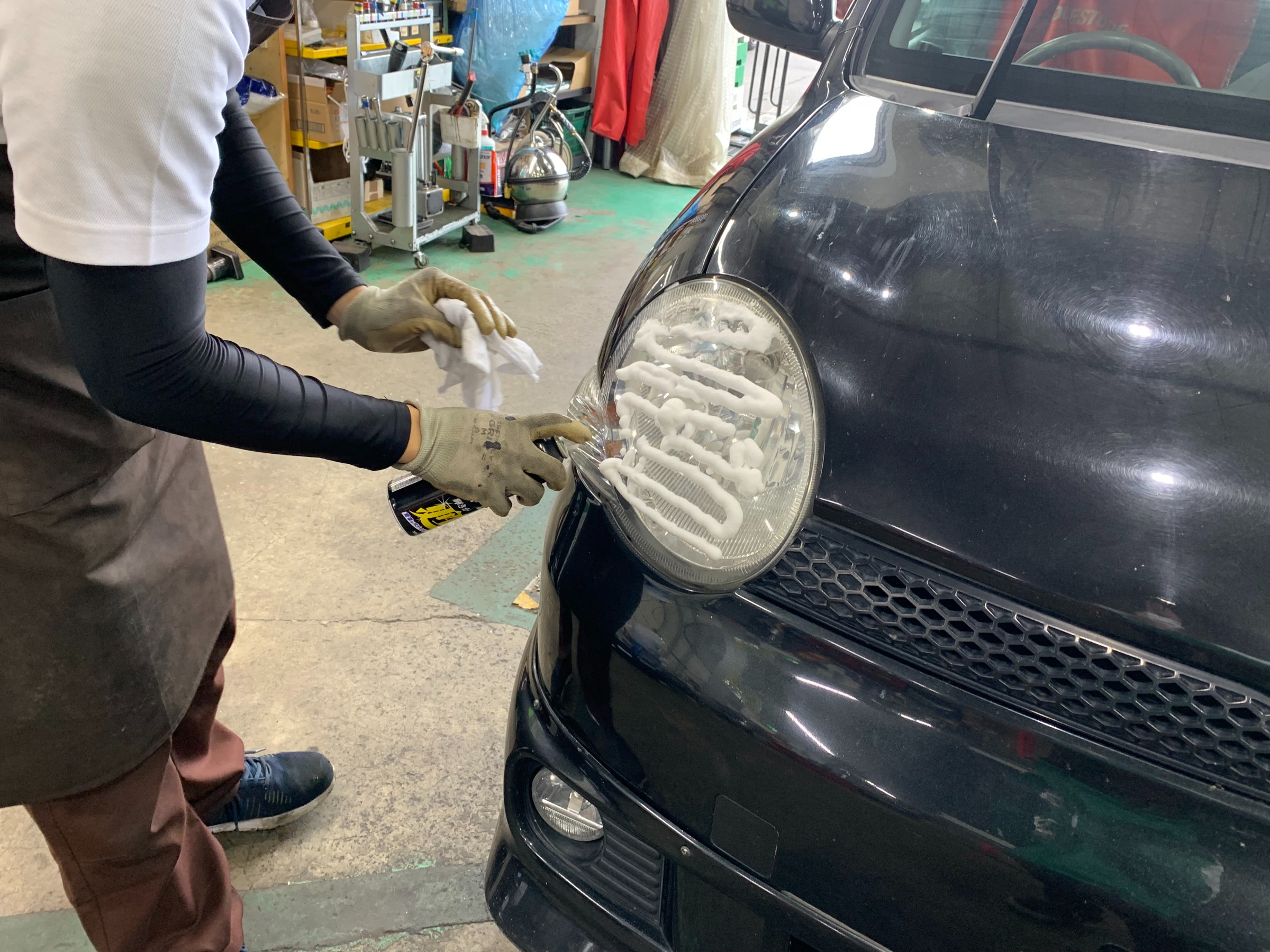 施工剤をヘッドライトに吹きかけて拭き上げます!!