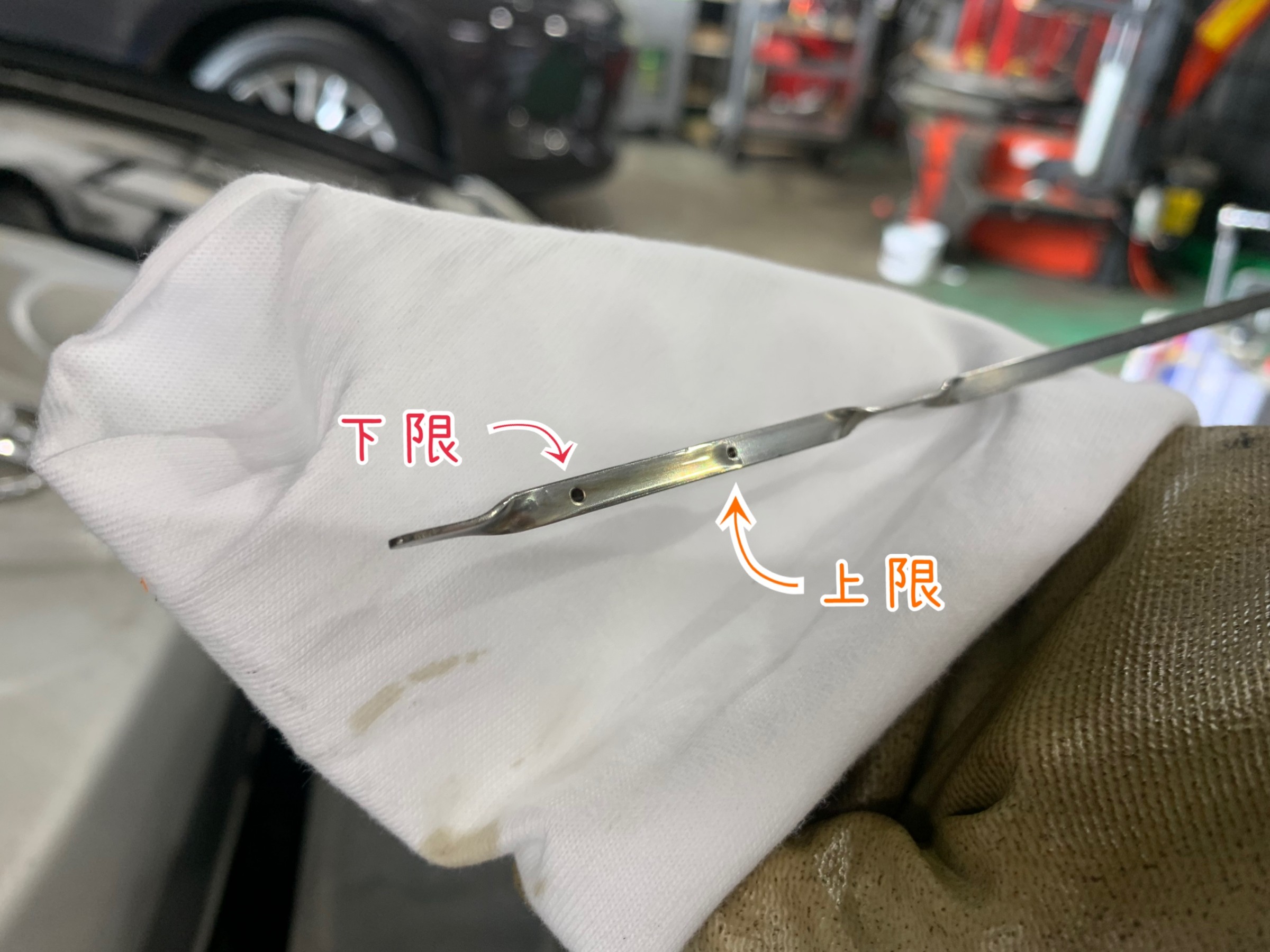 写真にあるように黒い点のところがオイル量の上限値と下限値です!