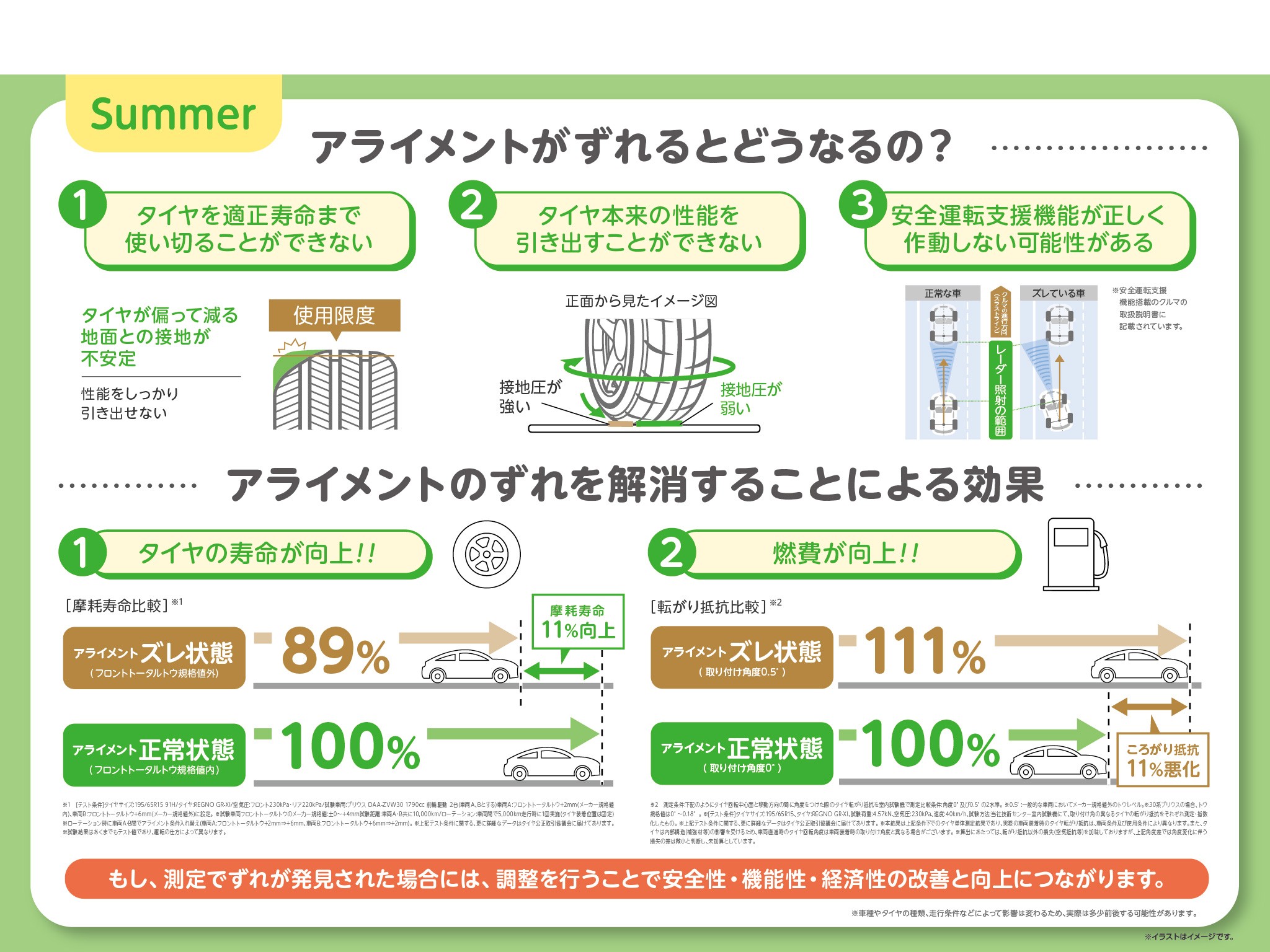 これらの原因によってアライメントがずれた時、車やタイヤにどのような影響が出るのかというと、最近ではタイヤの早期摩耗や燃費悪化だけでなく、安全支援機能が正しく機能しない場合があります。