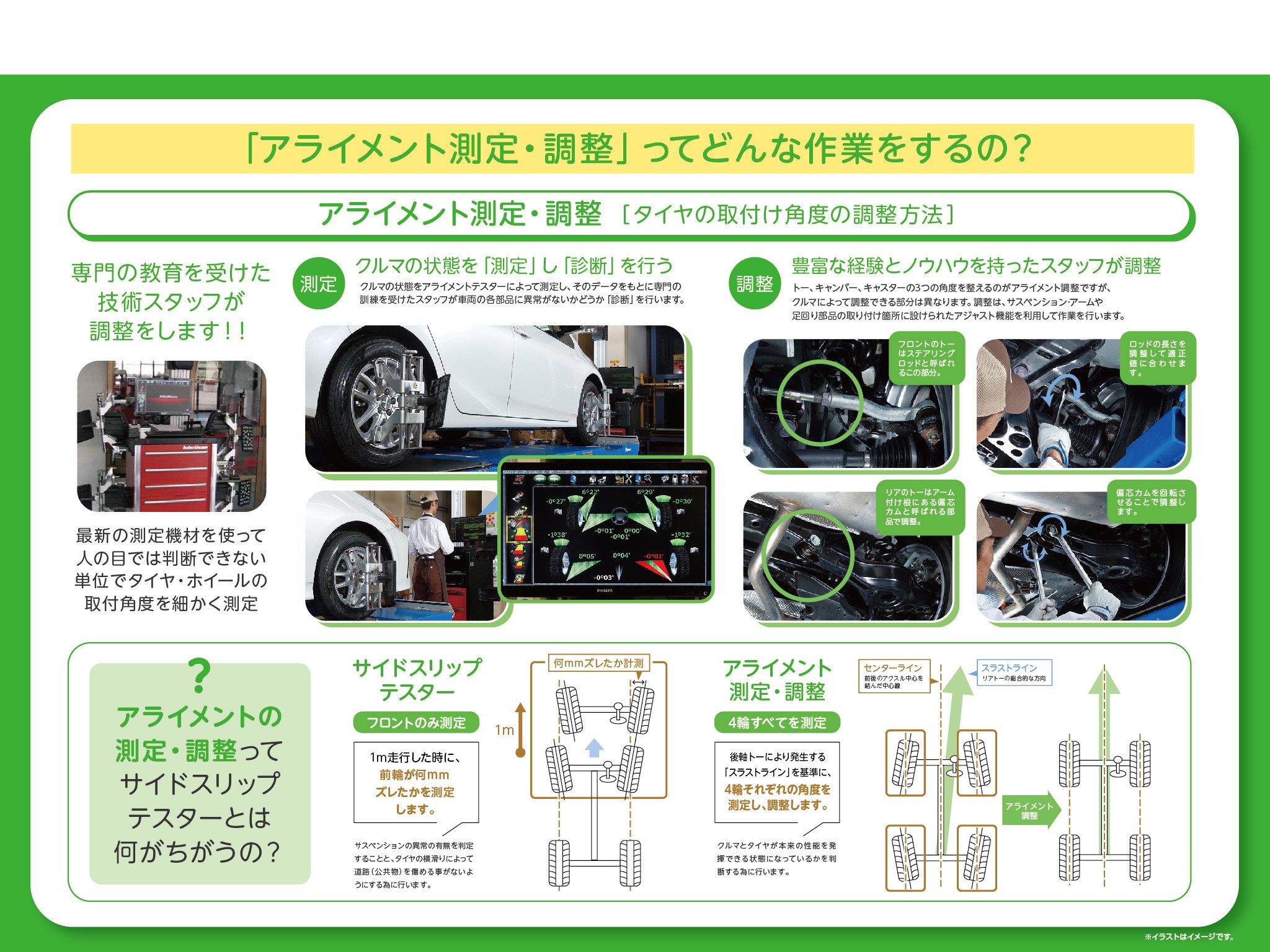あまり、馴染みのないアライメント調整ですが、どんな作業をしているのか下記の画像で解説します