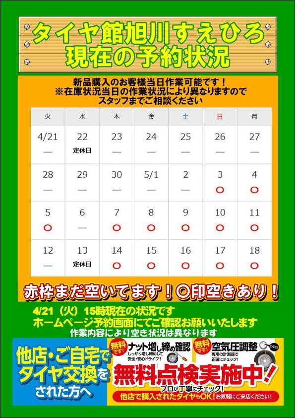 GW明けまだ予約空いてますよ!タイヤ・オイル品薄欠品が増えてます!お早目に